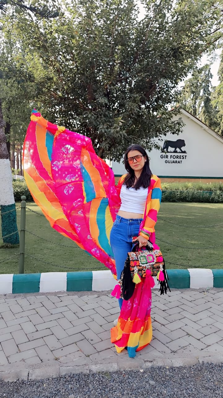 Yogita Gupta made this beautiful 6-meter flare multicolour shrug from us for her trip, and she totally loved it! Crafted from airy Chiffon, this piece is designed to dance with the wind and add a burst of color to her travel photos. A handcrafted creation by Shobhini, this shrug perfectly showcases our commitment to quality, craftsmanship, and timeless design.