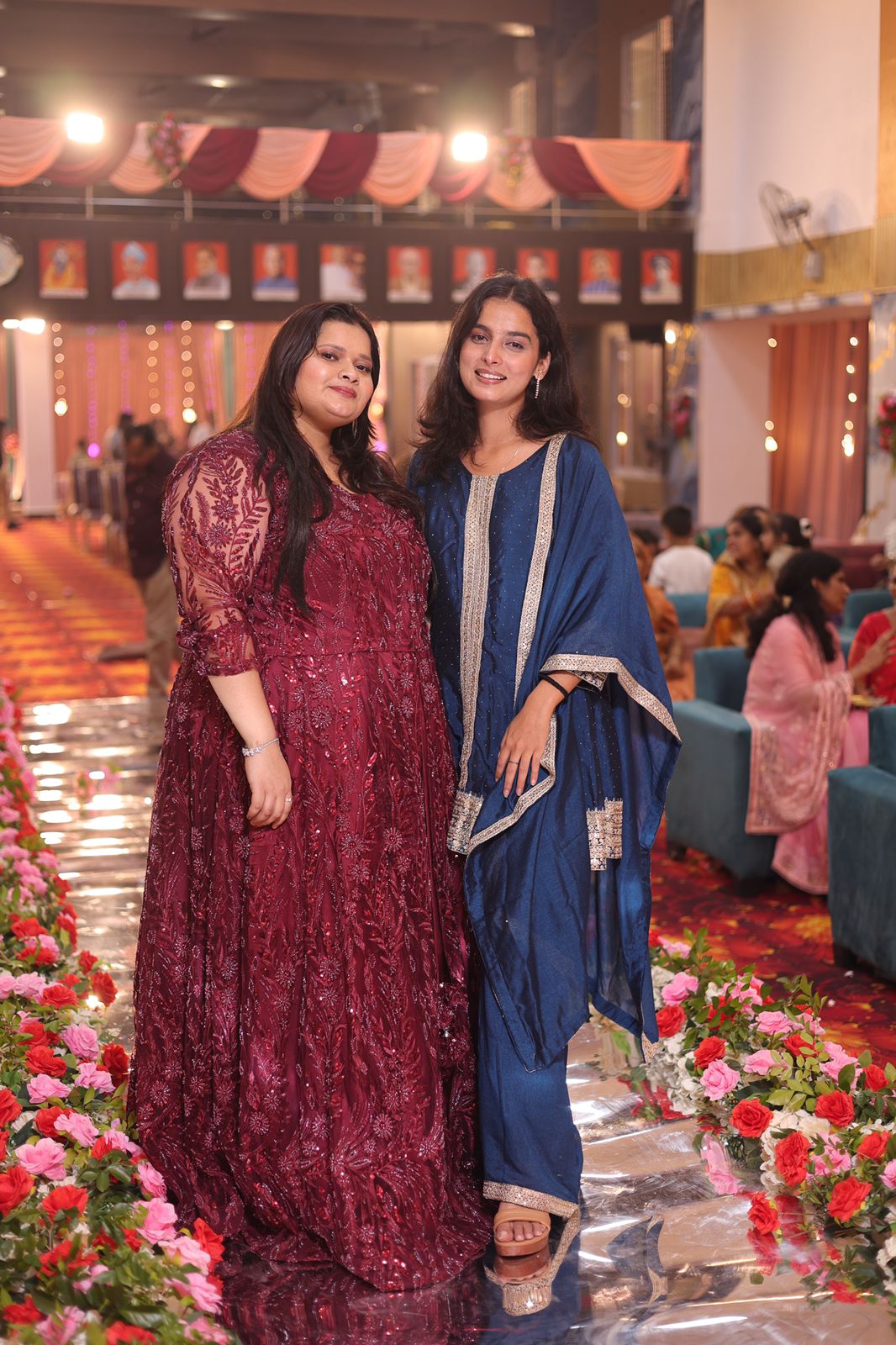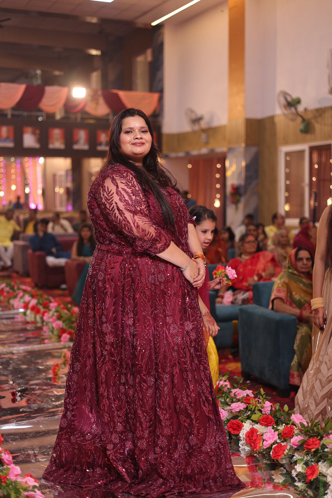 The outfit is a testament to meticulous craftsmanship, featuring a big-width maroon net fabric adorned with intricate, hand-embroidered floral patterns. The deep, regal maroon palette was chosen to command attention, while the structured corset silhouette offered a contemporary edge to the classic floral motifs.