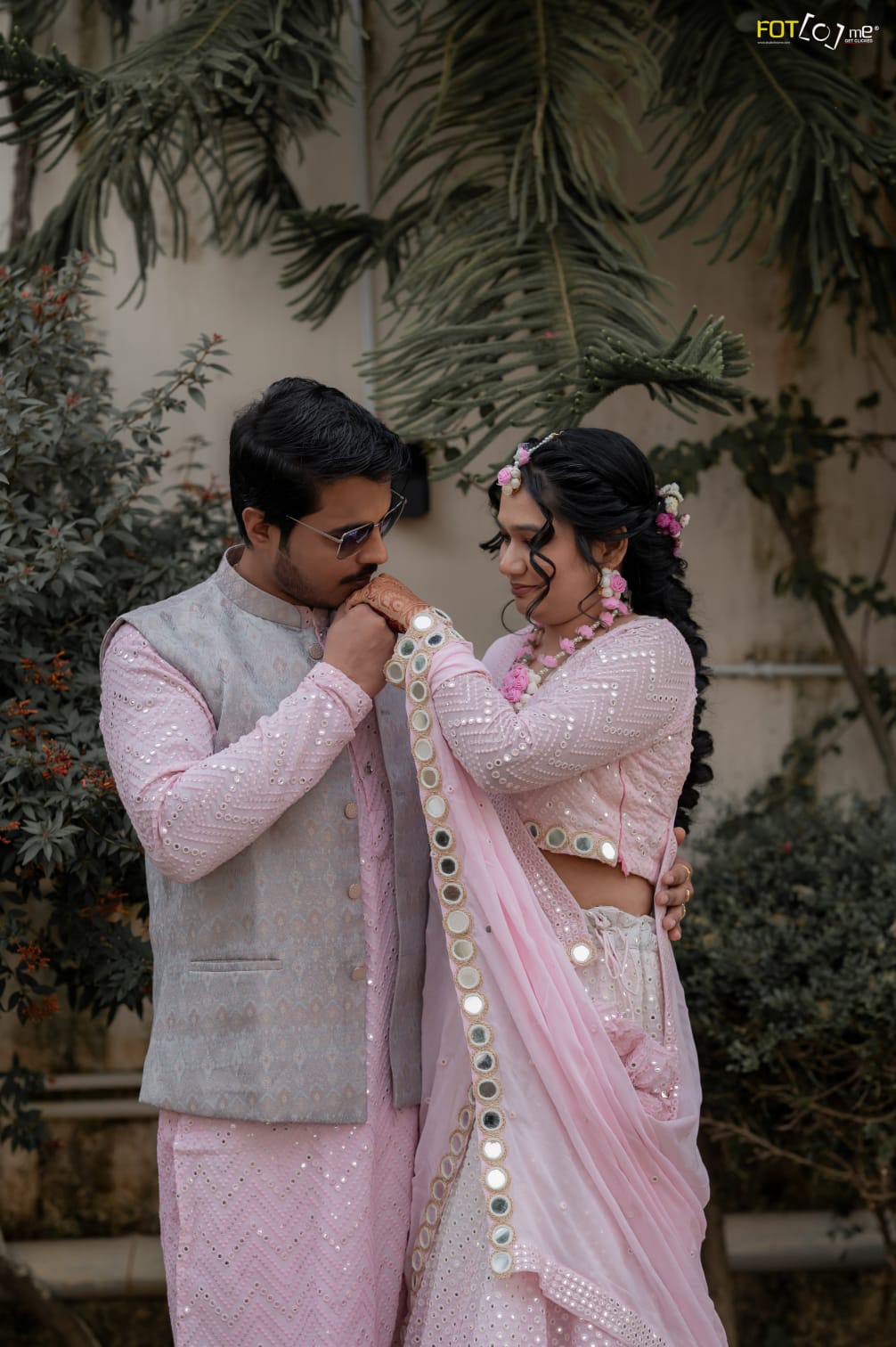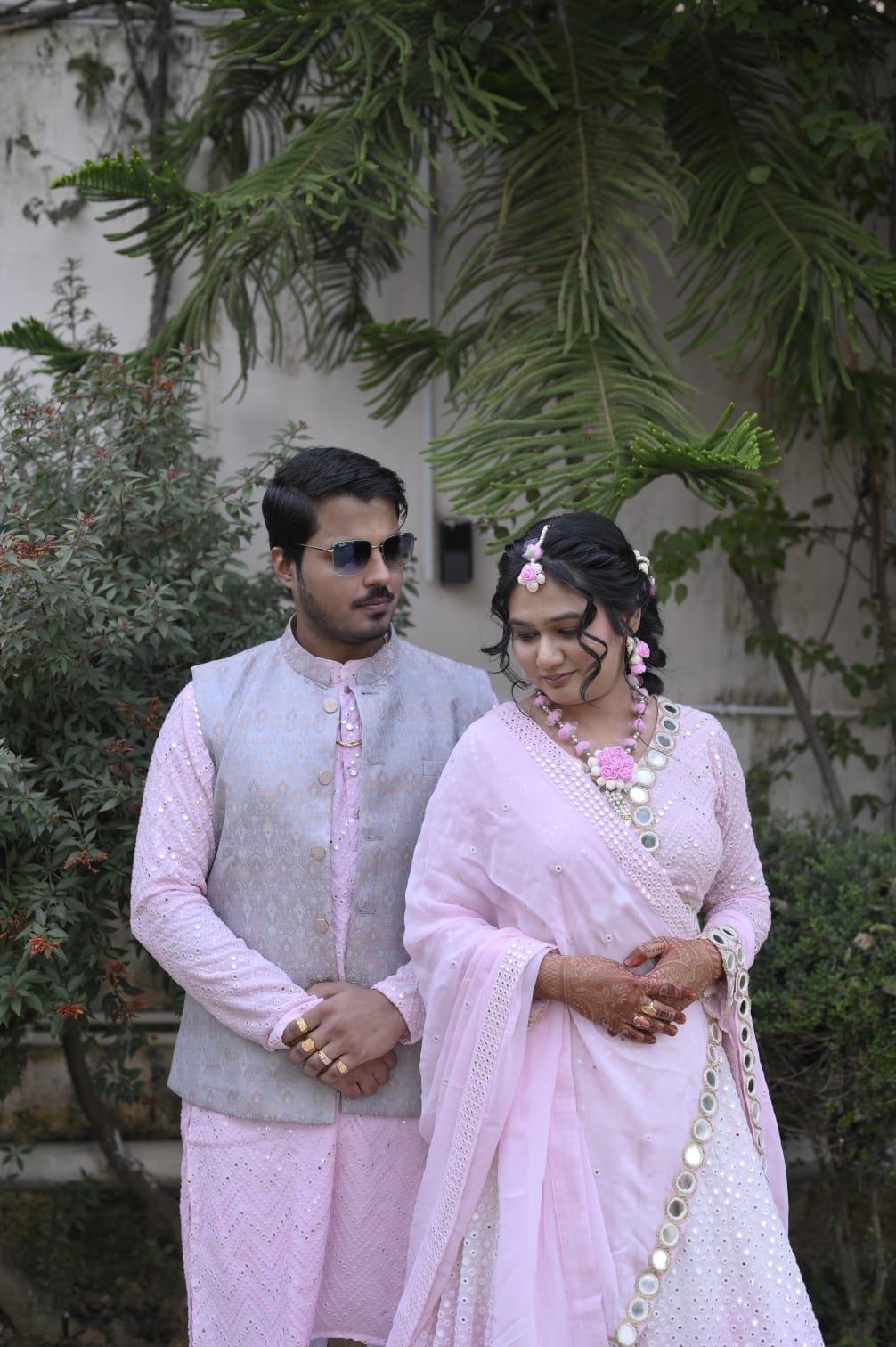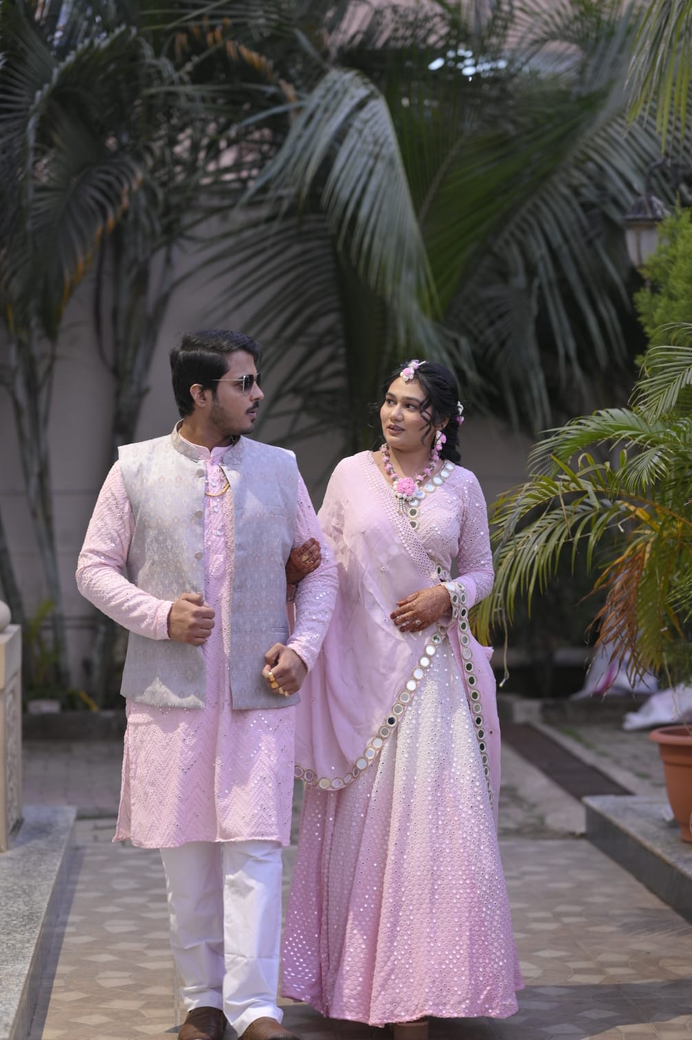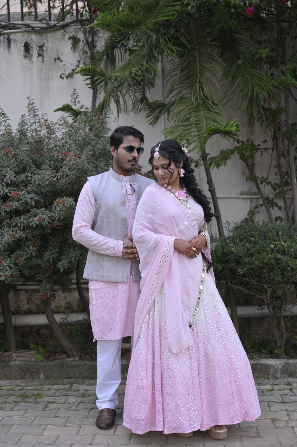 Akanksha made this beautiful couple outfit from us for her Haldi Ceremony, and she totally loved it! This coordinated Couple Outfit features a refreshing Pink and White palette, meticulously crafted from lightweight Georgette with stunning Faux Mirror Work. A handcrafted creation by Shobhini, this ensemble perfectly captures our commitment to quality, timeless design, and the joy of your special moments.