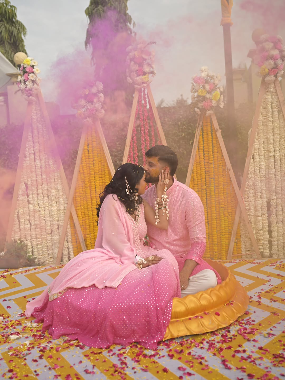 Varsha Chauhan came to us with a vision for her Haldi Ceremony, wanting a look that was as bright and joyful as the occasion itself. She chose a Customised Faux Mirror Ombre Couple Outfit to ensure she and her partner were perfectly coordinated for their special day—and she totally loved it!