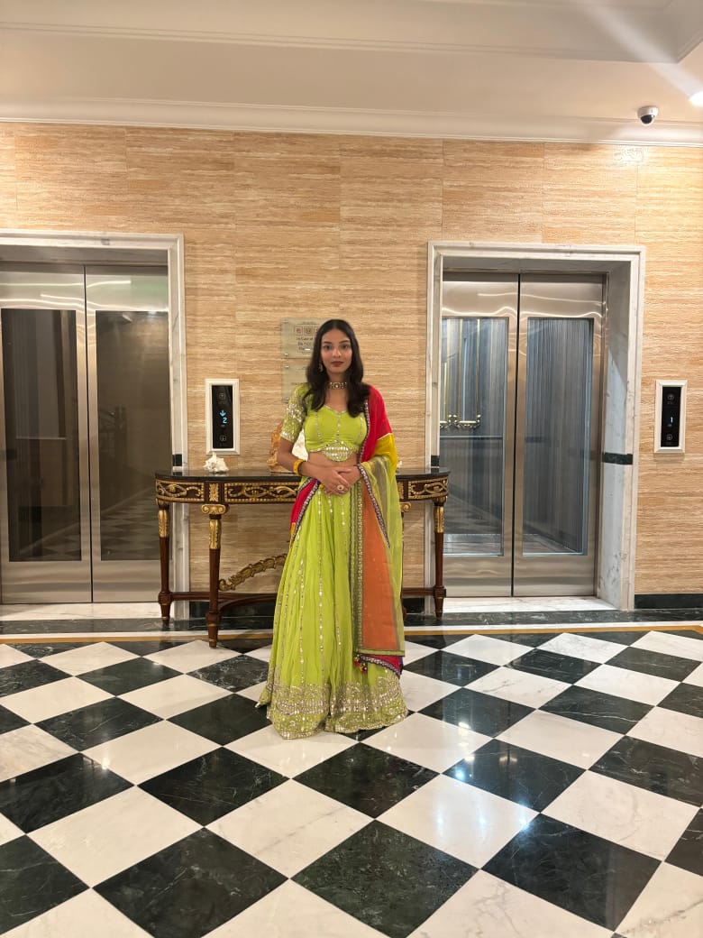 The Palette: A bold and vibrant Neon Green. This high-octane color choice brought a fresh, contemporary energy to her pre-wedding festivities.