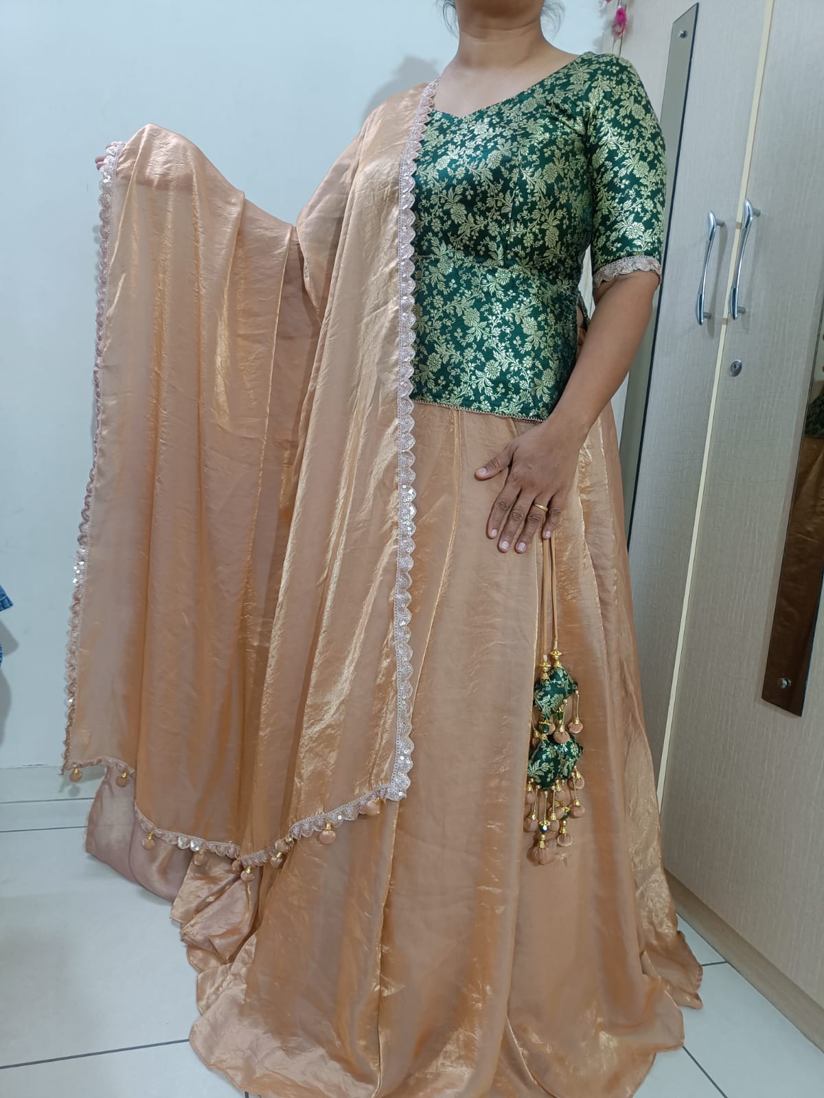 When Bhargavi Shah approached us to create an outfit for her friend’s Mehandi ceremony, she wanted a look that was both regal and easy to move in. She made this beautiful Lehenga with us, and she totally loved it! The combination of the rich green blouse against the shimmering golden skirt made her stand out beautifully while perfectly honoring the traditional festive palette.