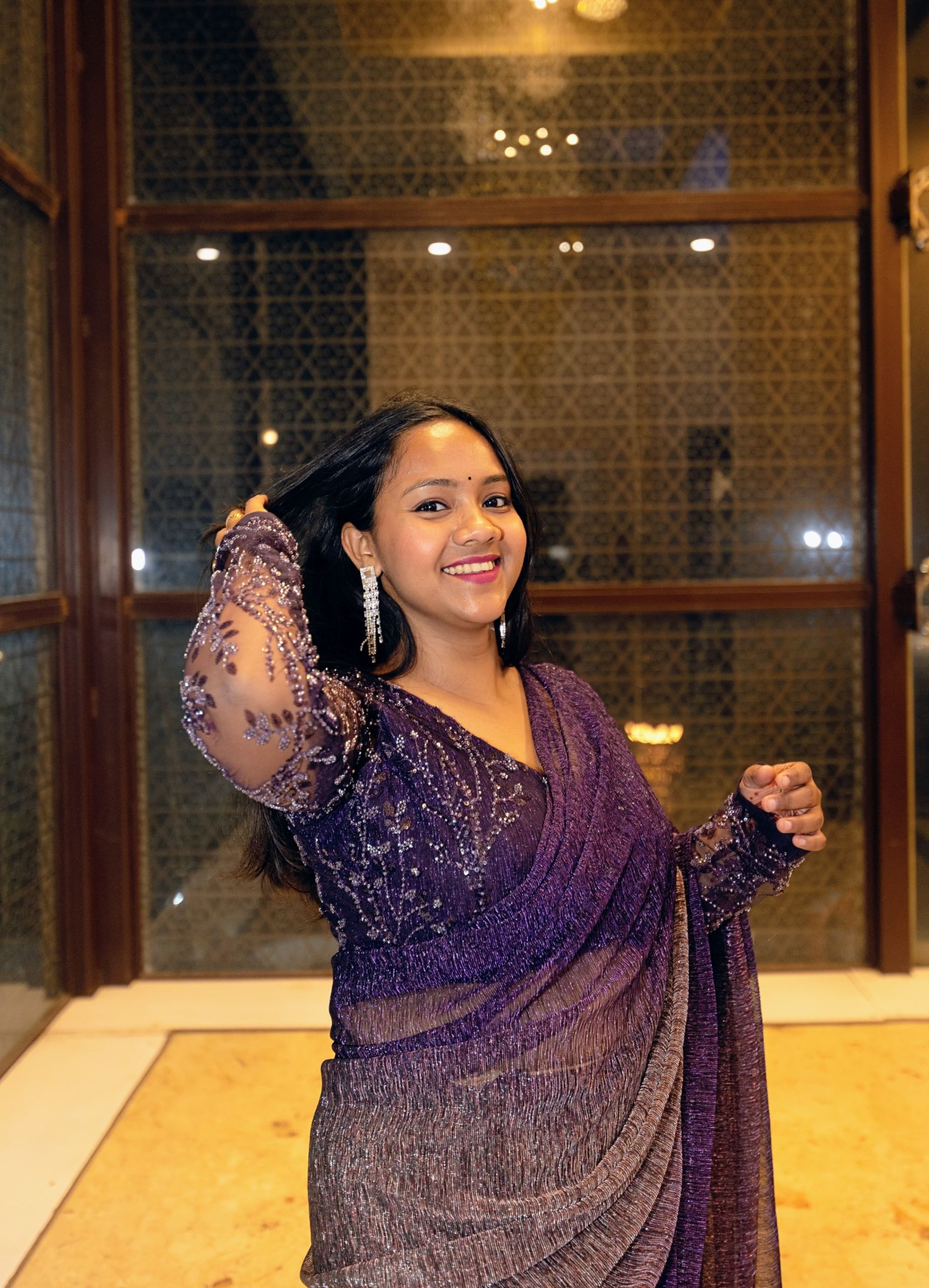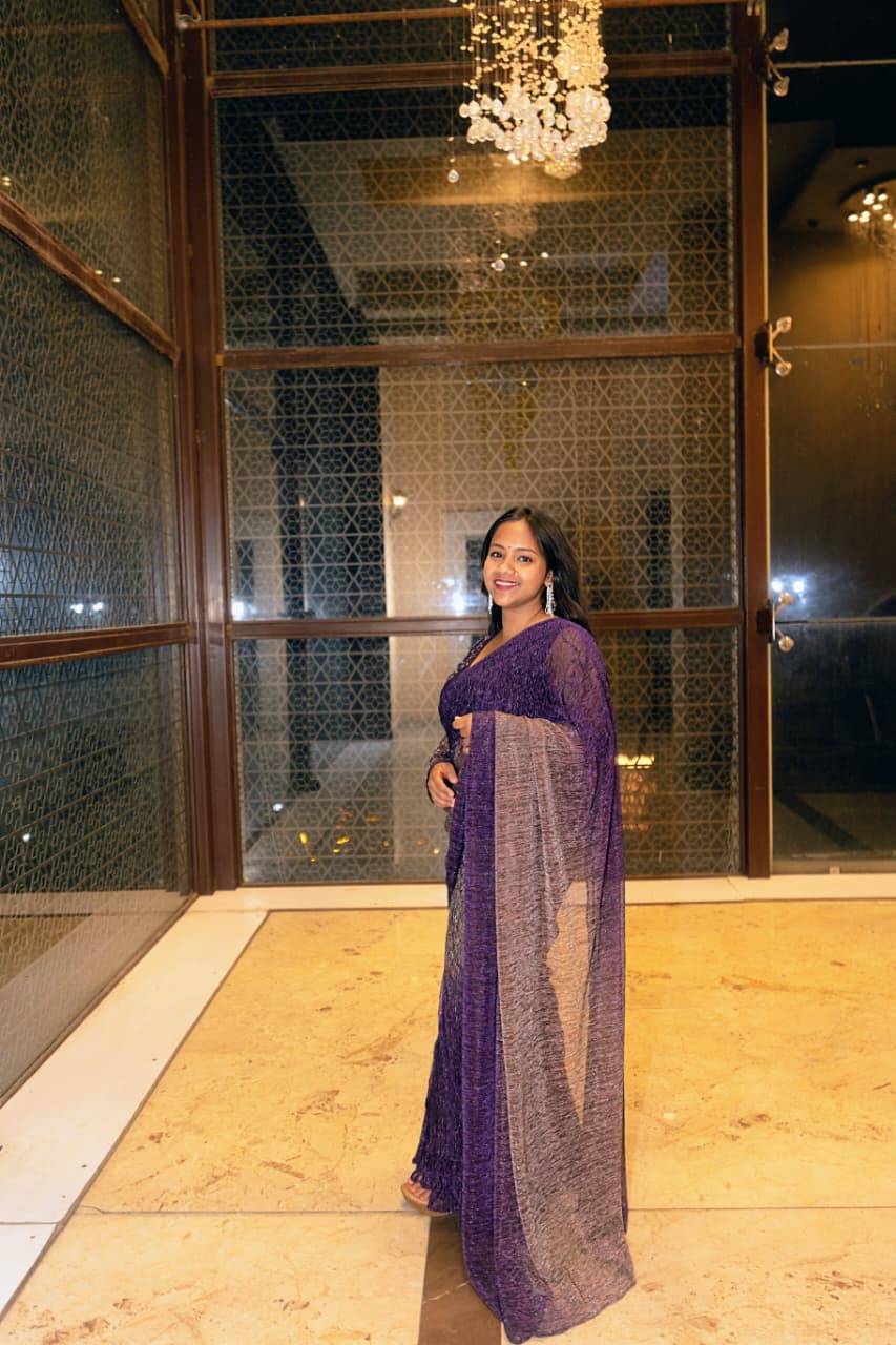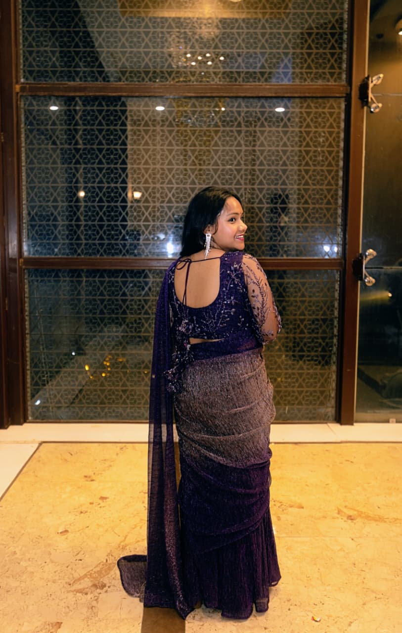 Saumya totally loved the final look, and it’s easy to see why! We custom-designed this piece using luxurious Shimmer Lycra fabric, chosen specifically for its beautiful drape and the way it catches the light with every movement. The deep, royal purple color palette adds an air of mystery and sophistication, making it the ultimate “showstopper” piece for a high-energy celebration.