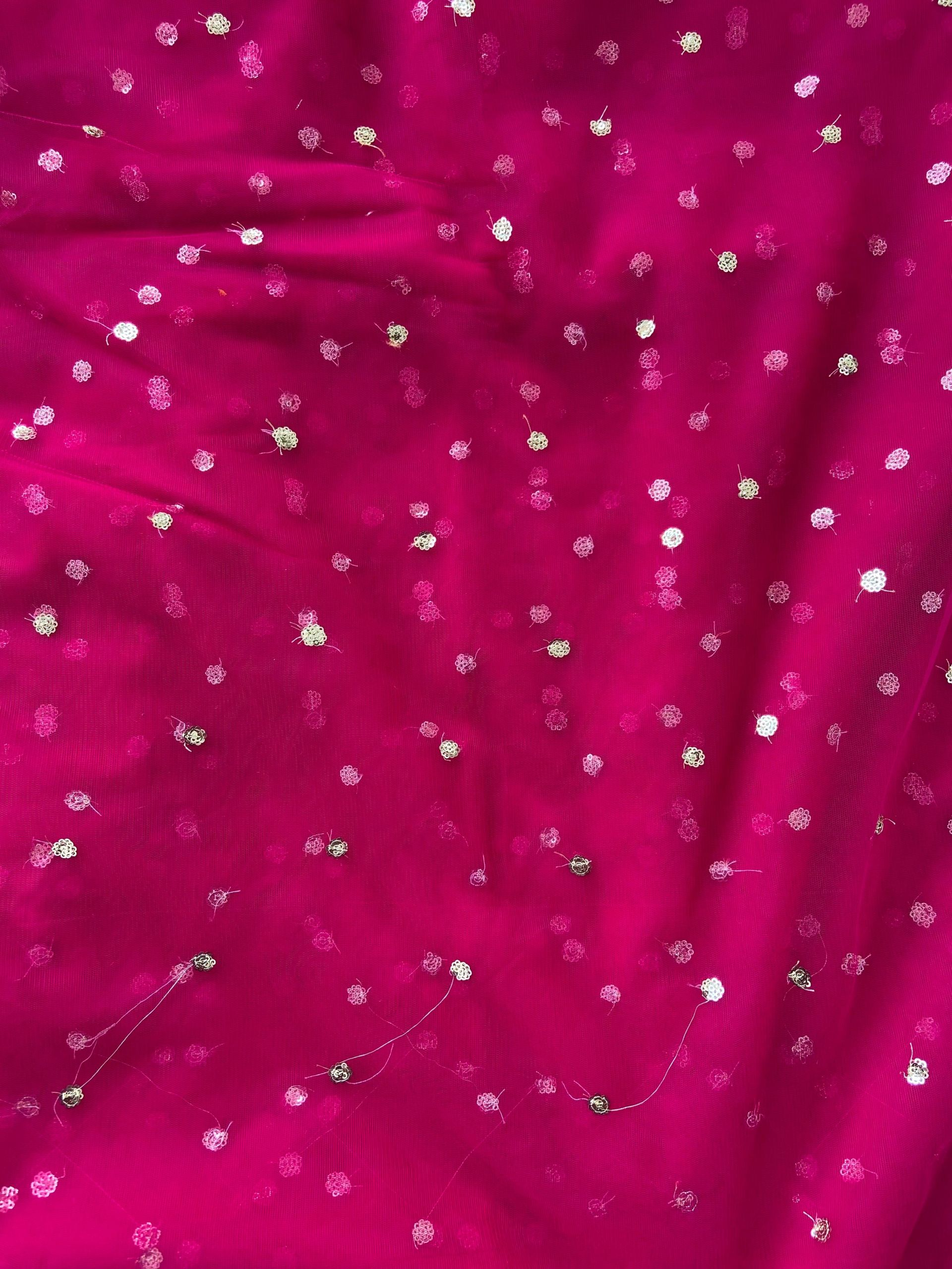 Make a bold and beautiful statement with this Rani Pink Net Fabric, featuring all-over gold sequin buti embroidery. The deep, regal pink shade combined with sparkling gold sequins creates a luxurious and festive look—perfect for bridal wear, sangeet outfits, or show-stopping dupattas.