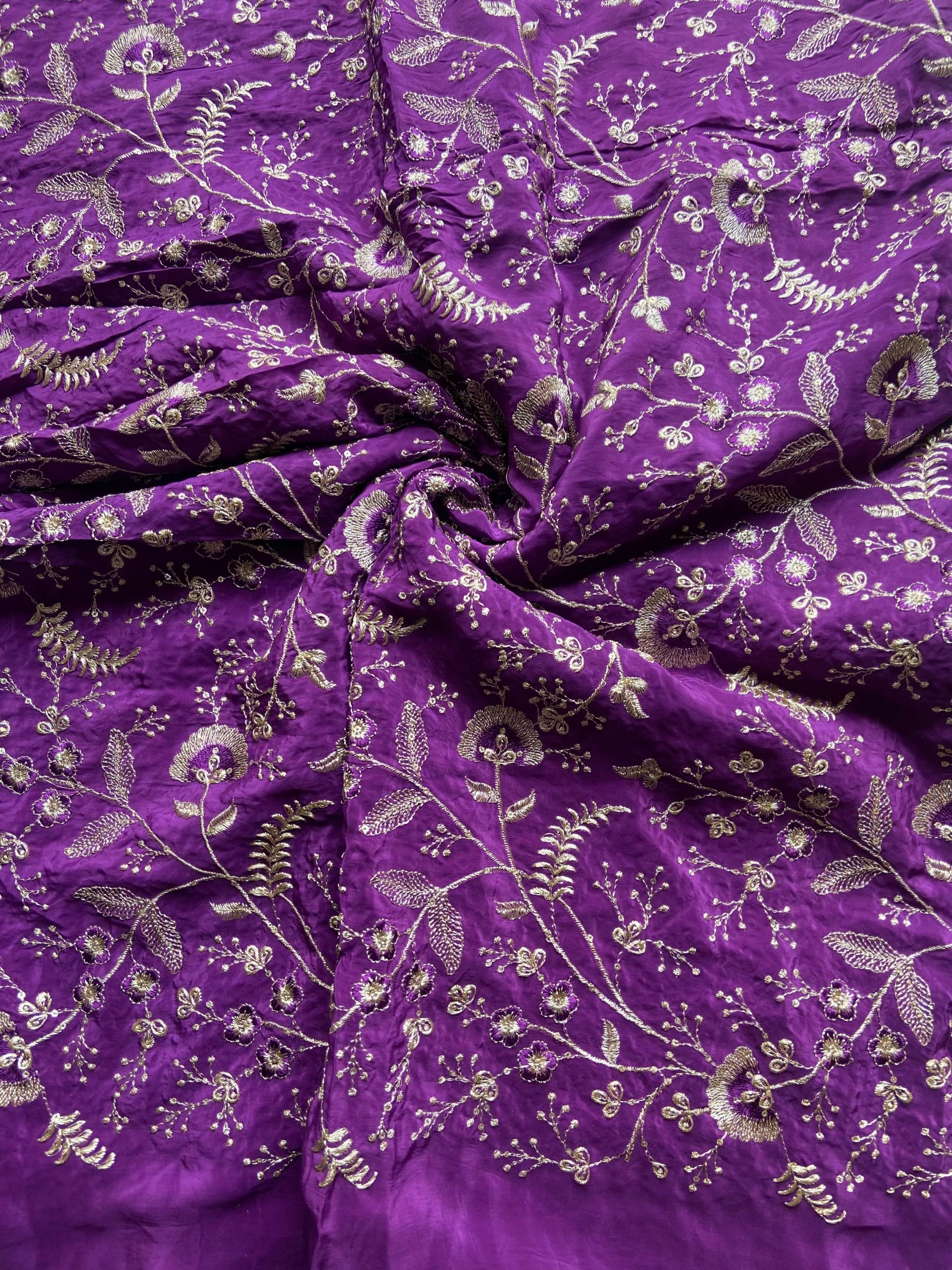 Indulge in timeless elegance with our Dark Purple Pure Crepe Fabric, adorned with exquisite all-over Zari embroidery. This luxurious fabric combines the fluid drape and soft texture of high-quality crepe with the shimmering beauty of intricate metallic threadwork.