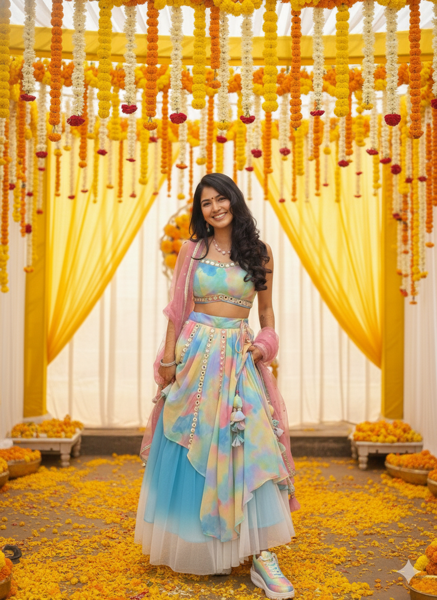 Asymetric Multicoloured Mirror embroidery custom lehenga