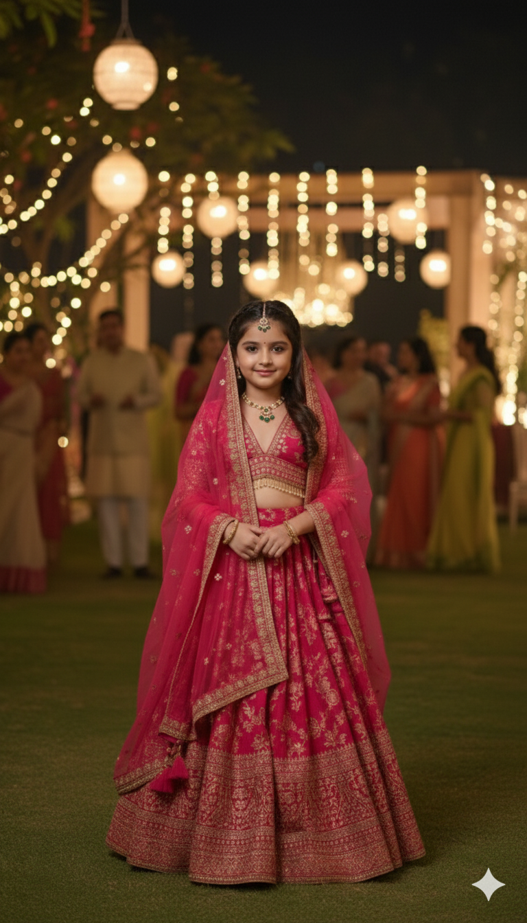 The Shobhini Heritage While the look is rooted in antiquity, the fit is purely modern. This lehenga is pre-stitched for a flawless, comfortable fit that respects the active nature of childhood. It is a piece designed for those monumental family moments—weddings, temple visits, and grand receptions—where memories are made to last as long as the fabric itself.