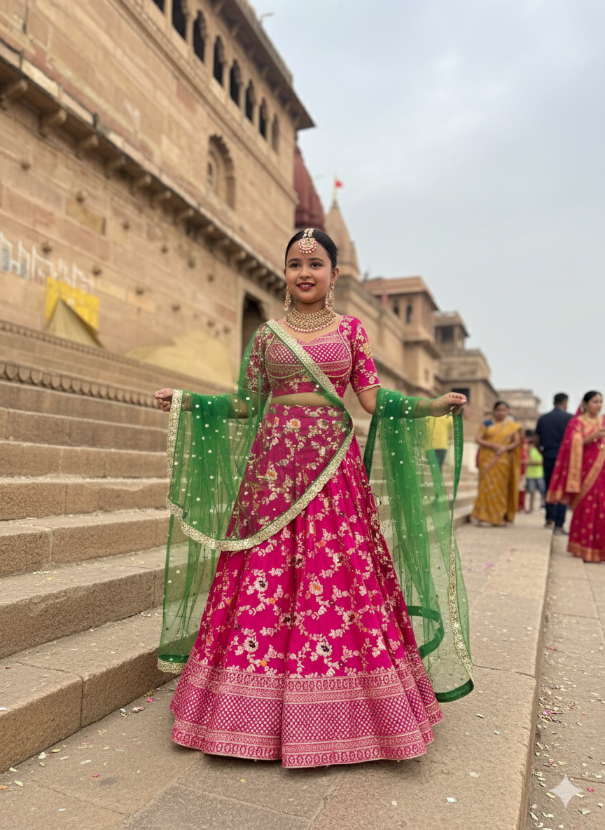 There is a soulful rhythm in the weave of a Banarasi silk—a story of patience, craft, and unparalleled luxury. At Shobhini by Tini Komal, we have captured this essence in our Rani Pink & Emerald Green Banarasi Lehenga, ensuring your child carries a piece of history with every step.
