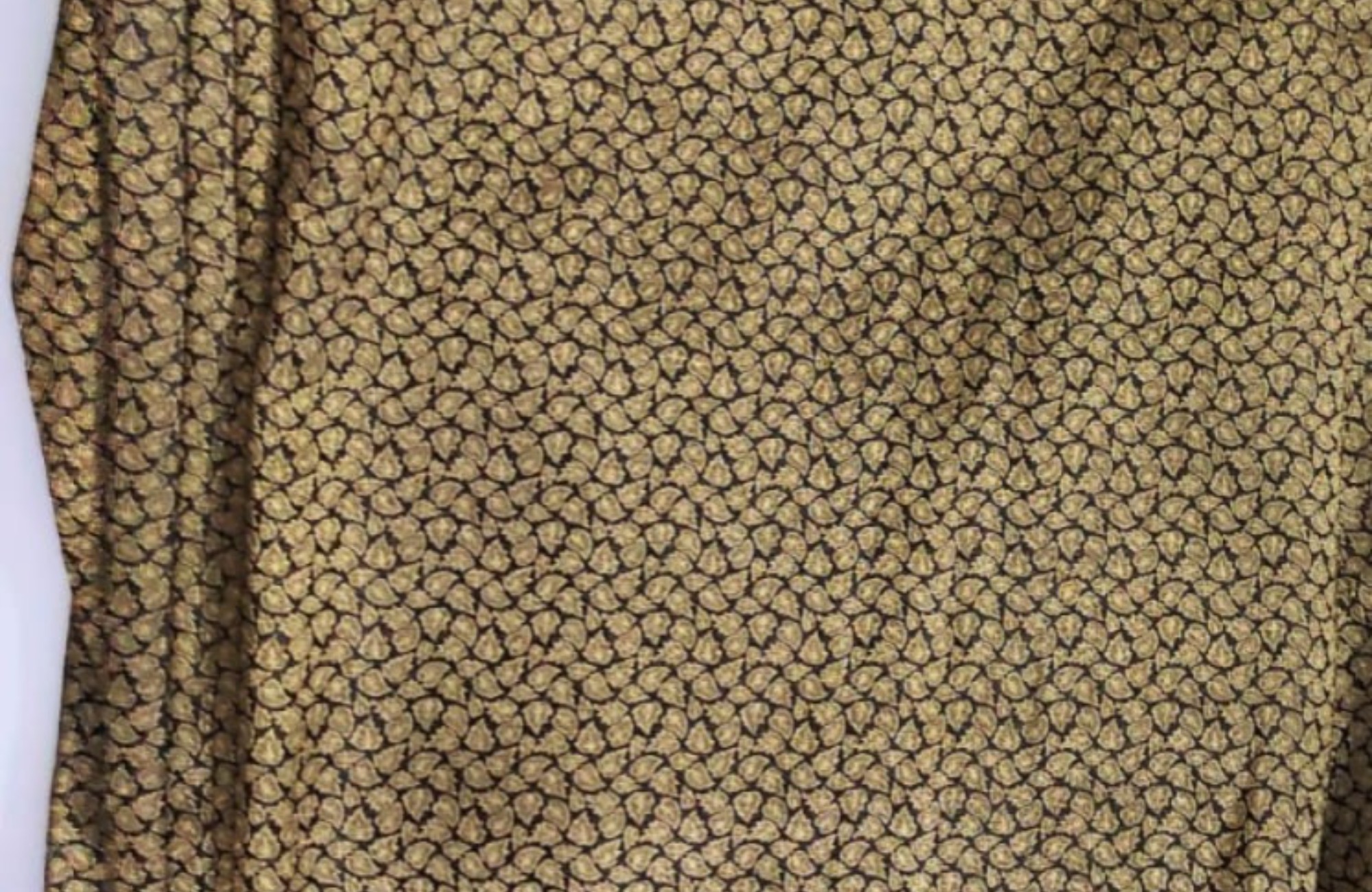 Design & Craftsmanship This exquisite fabric is a testament to the heritage of Banarasi weaving. Set against a deep, midnight black base, the textile is densely ornamented with an all-over pattern of gold zari. The motif features a repeating “Keri” or stylized leaf-bud design, meticulously woven into the silk to create a textured, three-dimensional effect known as Kimkhab or heavy brocade.