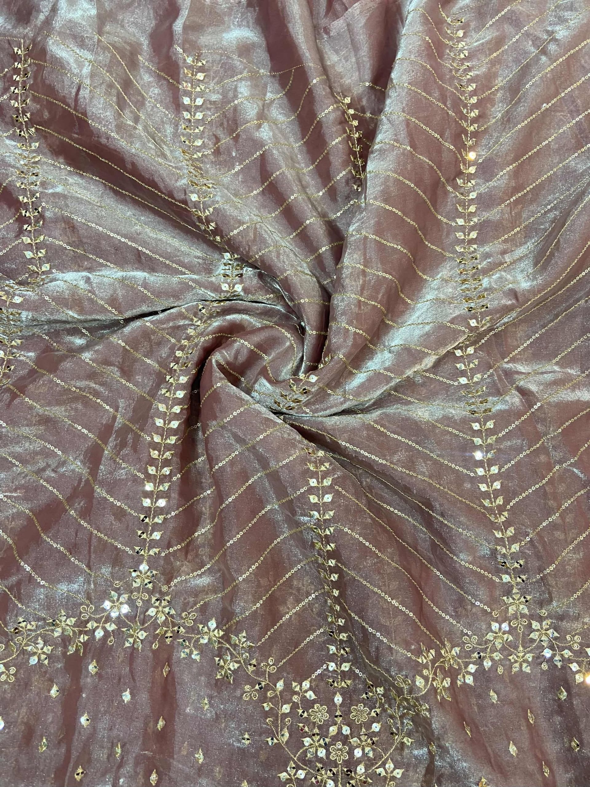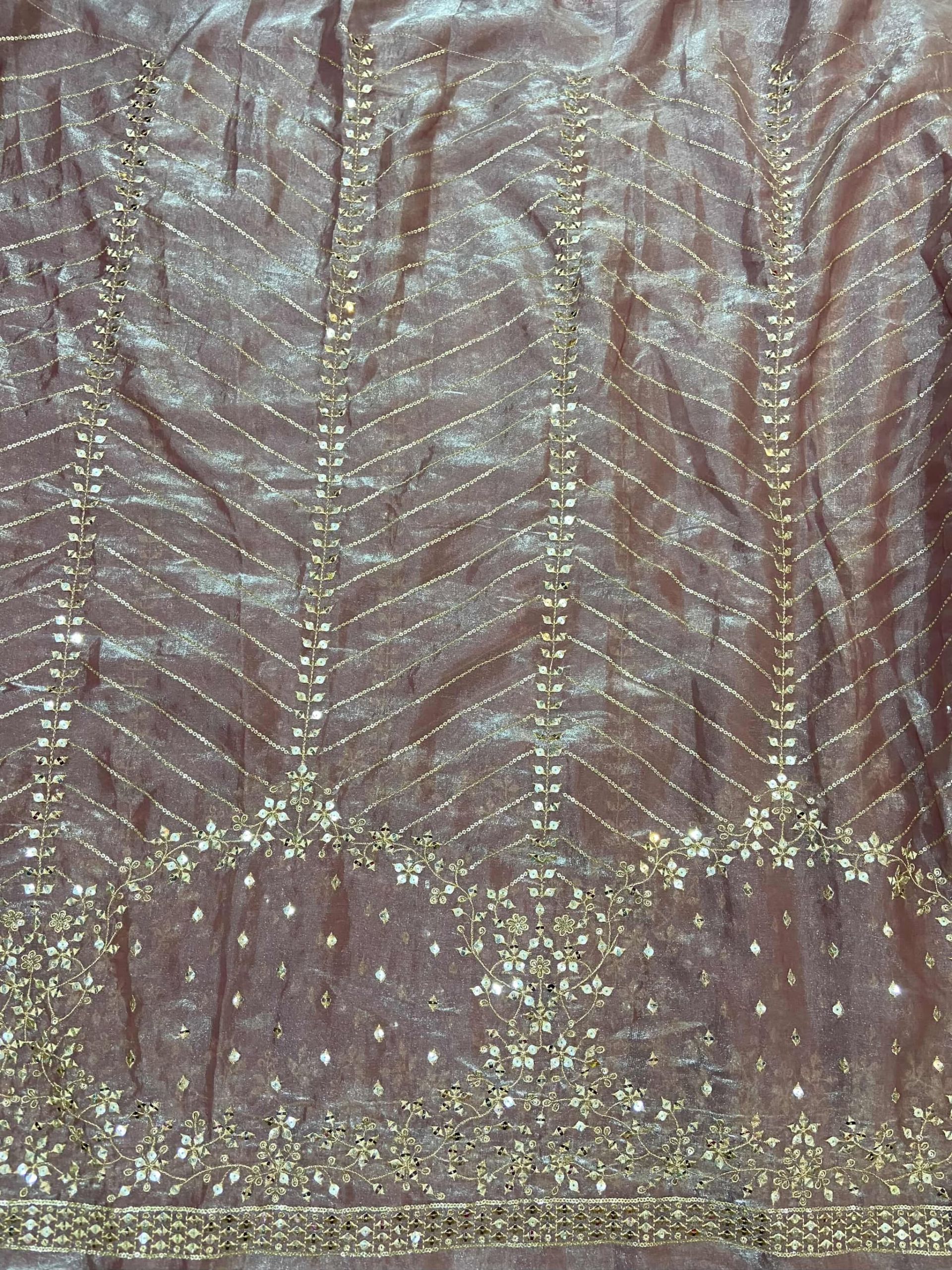 This elegant Blush Pink Organza Satin fabric features a shimmering metallic finish adorned with intricate gold zari and sequin embroidery. The design transitions from delicate vertical chevron patterns into a heavy daman-style floral border, offering a luxurious and sophisticated look for high-end ethnic wear.