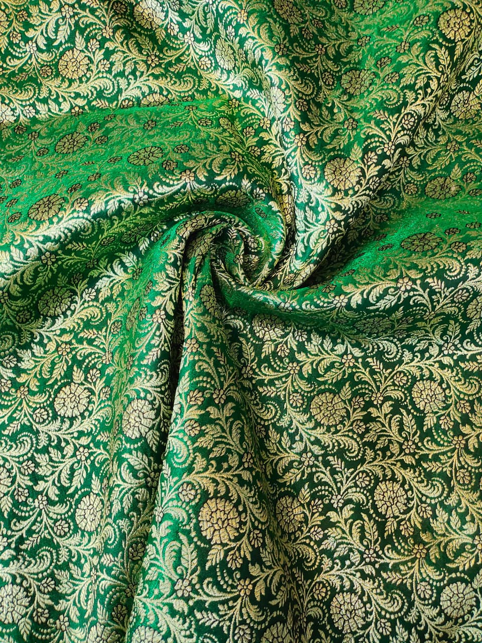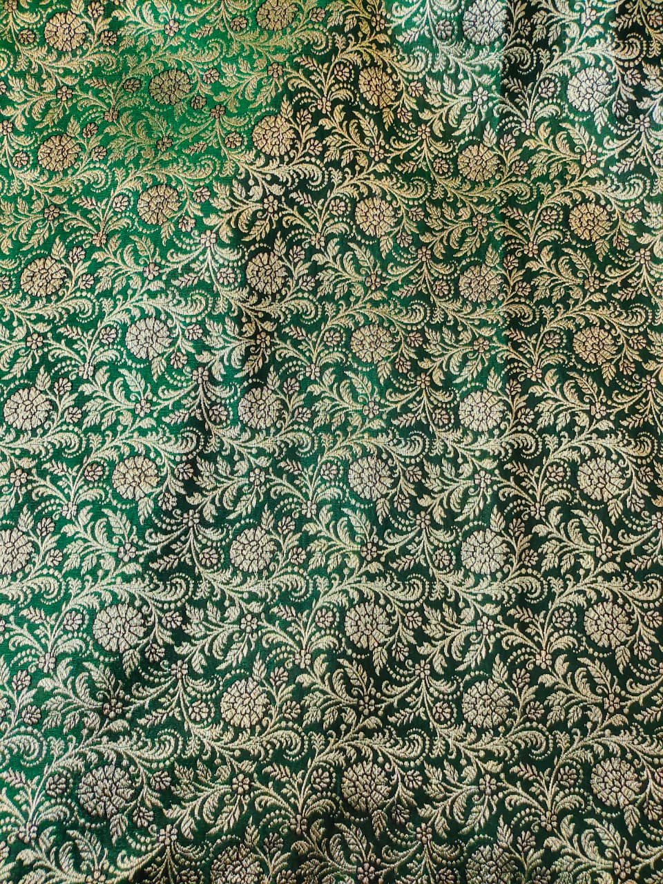 The deep bottle green base enhances the richness of the traditional Banarasi weave, while the delicate floral motifs add a touch of femininity and sophistication. Crafted with fine detailing, the fabric offers a lustrous finish and a graceful drape, making it an ideal choice for festive wear, weddings, and grand celebrations.