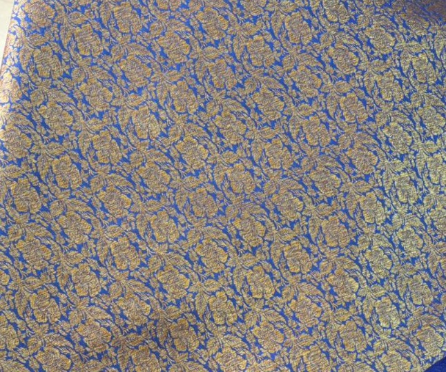 Royal Blue Banarasi Silk Brocade Fabric Exude royalty with this exquisite Banarasi silk fabric in a vibrant royal blue. Featuring an all-over, intricate gold zari floral jaal (pattern), this rich brocade offers a structured yet supple feel. It is the definitive choice for creating opulent ethnic bridal wear and festive statement pieces.