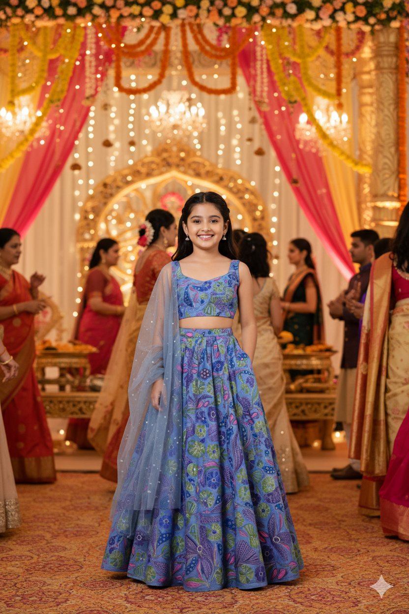 The Design Details The lehenga features a breathtaking multicolored botanical print, blending shades of violet, moss green, and sunset pink against a rich blue base. The blouse is kept modern and minimal with a sleeveless cut and a clean neckline to balance the richness of the skirt. For a touch of practical magic, we’ve included hidden pockets in the voluminous skirt—perfect for keeping little treasures close. The look is completed with a sheer, light blue net dupatta adorned with a delicate spray of sequins, mimicking a starry sky.
