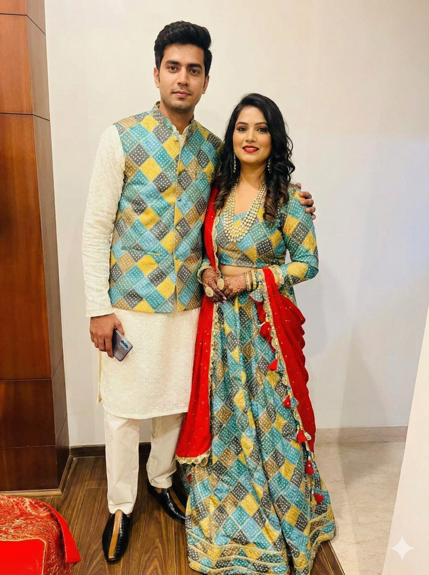 The blouse is a masterclass in understated elegance, with its full sleeves offering a graceful, elongated silhouette that balances the playful colors of the print. The lehenga skirt is where the magic truly happens—with a heavy five-meter flare, it creates a dramatic, sweeping movement that turns every step into a statement. To add a touch of airy softness, the net dupatta drapes effortlessly, framed by a delicate border that adds just the right amount of definition. For the groom, we’ve ensured a perfect harmony; his Bandi carries the same artisanal print, grounded by the rich, substantial feel of a Pure Raw Silk kurta and pajama.