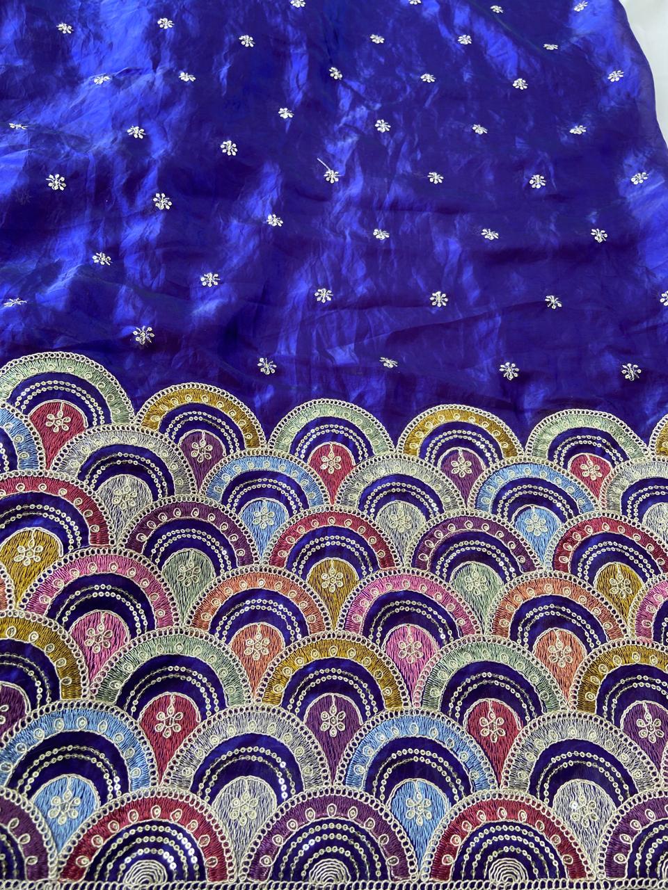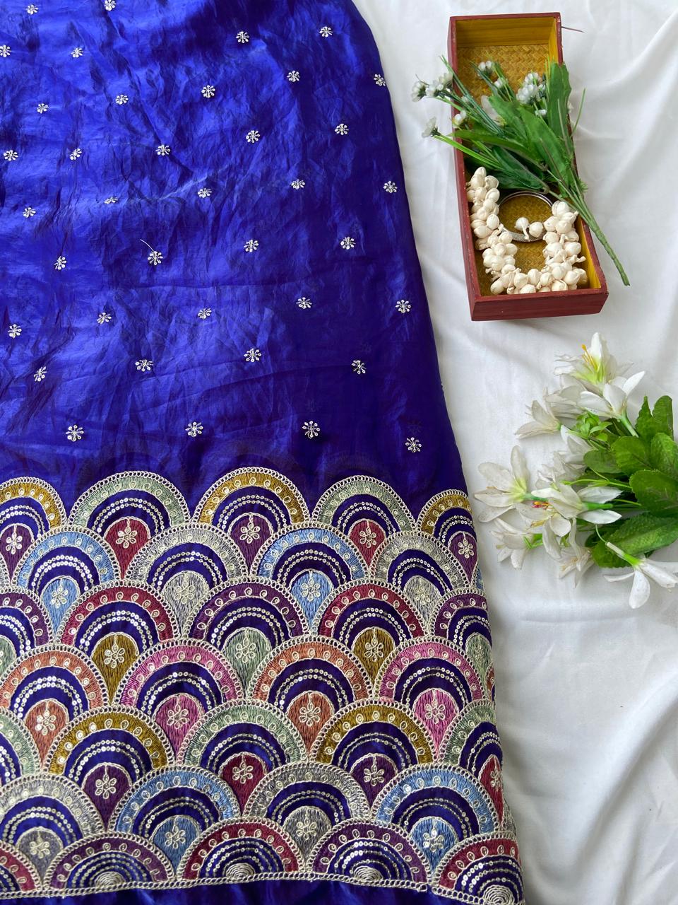 The magic lies in the subtle artistry of the embroidery, which adds a gentle shimmer to the deep blue Chinon without ever feeling heavy. The fabric is celebrated for its stunning “fall”—it flows around you as you walk, catching the light with a soft, sophisticated sheen. The elegant blouse frames you perfectly, while the sharara pants surprise with an incredible five-meter flare, giving you the grand volume of a lehenga with a modern, spirited twist. Topped with a weightless net dupatta that adds a touch of drama to every gesture, this ensemble is a masterclass in understated luxury.