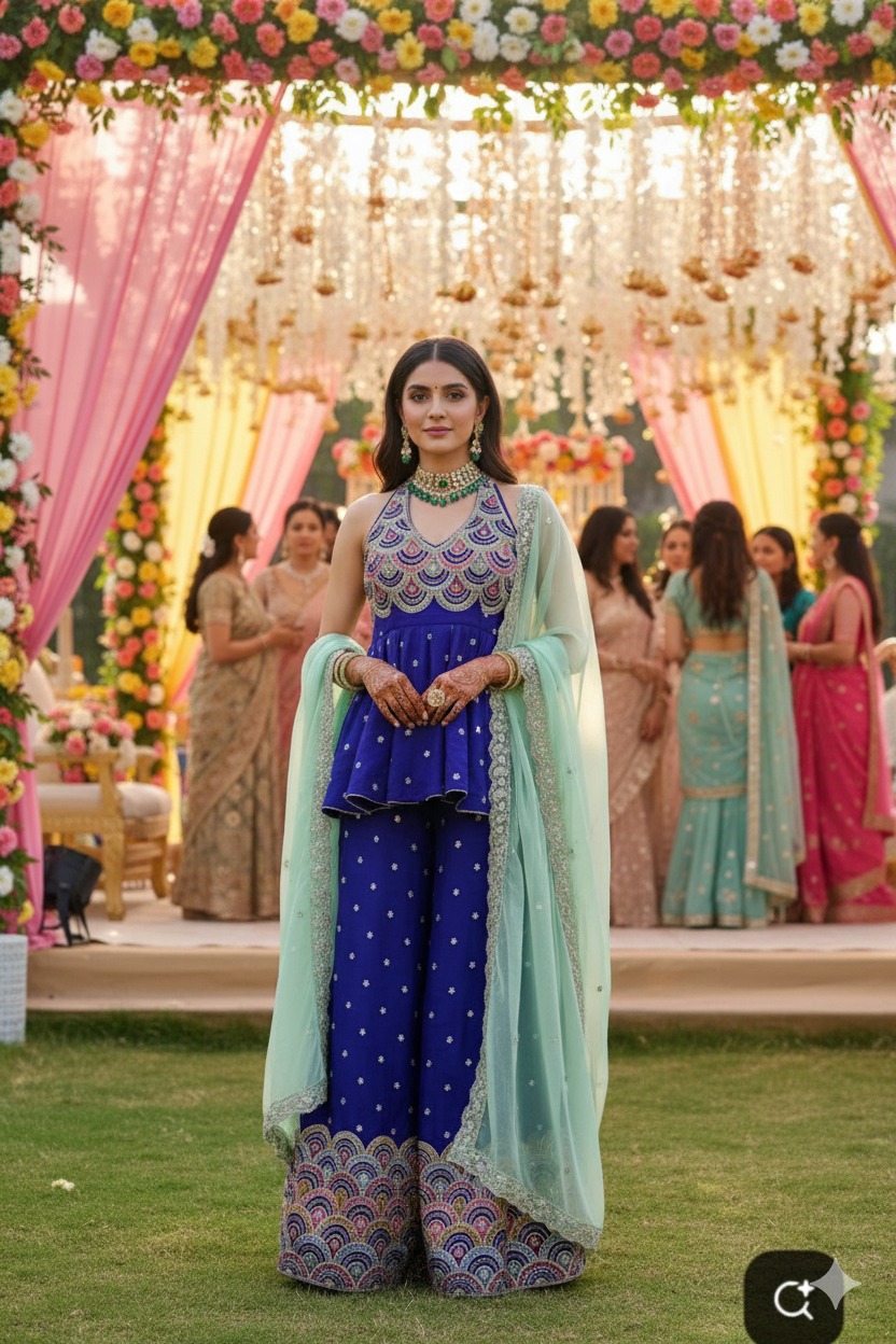Please note: The imagery featuring the bride and the groom’s Kurta and Bundi is an AI illustration, thoughtfully created to help you visualize the rich textures and the beautiful way this sharara set moves once it is handcrafted for you.