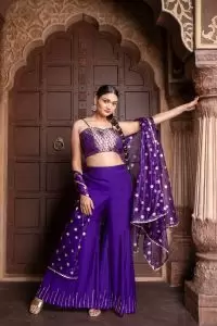 Elevate your festive wardrobe with our stunning 3-piece ensemble, perfect for the Diwali occasion. This set includes a luxurious brocade blouse, wide-leg pants, and a dupatta adorned with intricate gota work, all in a rich, regal purple hue.