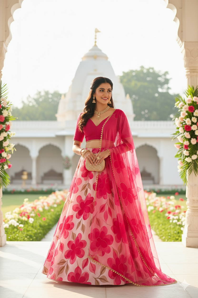 Step into a romantic dream with this enchanting pink lehenga set. It feels incredibly light and airy, like wearing a soft cloud sprinkled with vibrant flowers. The organza fabric is alive with large, painterly floral prints in deepening rose tones, creating a look that is both fresh and radiantly feminine.