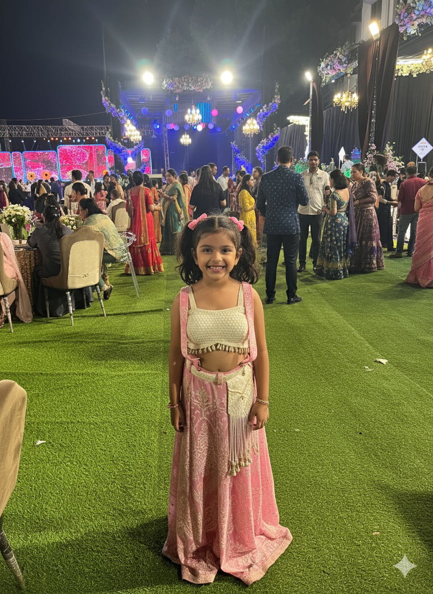 The Shobhini Promise We know that for a child, the best memories are made in comfort. This set is pre-stitched for an effortless “slip-on” fit and fully lined with soft, skin-friendly fabric. Whether it’s a vibrant Haldi ceremony, a sun-drenched Mehendi, or a festive evening party, she’ll be the most comfortable and chic guest in the room.