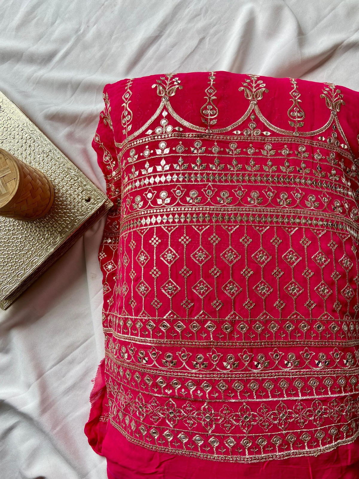 Elevate your couture collection with this exquisite dark pink Georgette fabric, a masterpiece of traditional craftsmanship and contemporary vibrance. The fabric serves as a rich canvas for intricate gold sequin embroidery, designed to capture and reflect light with every movement.