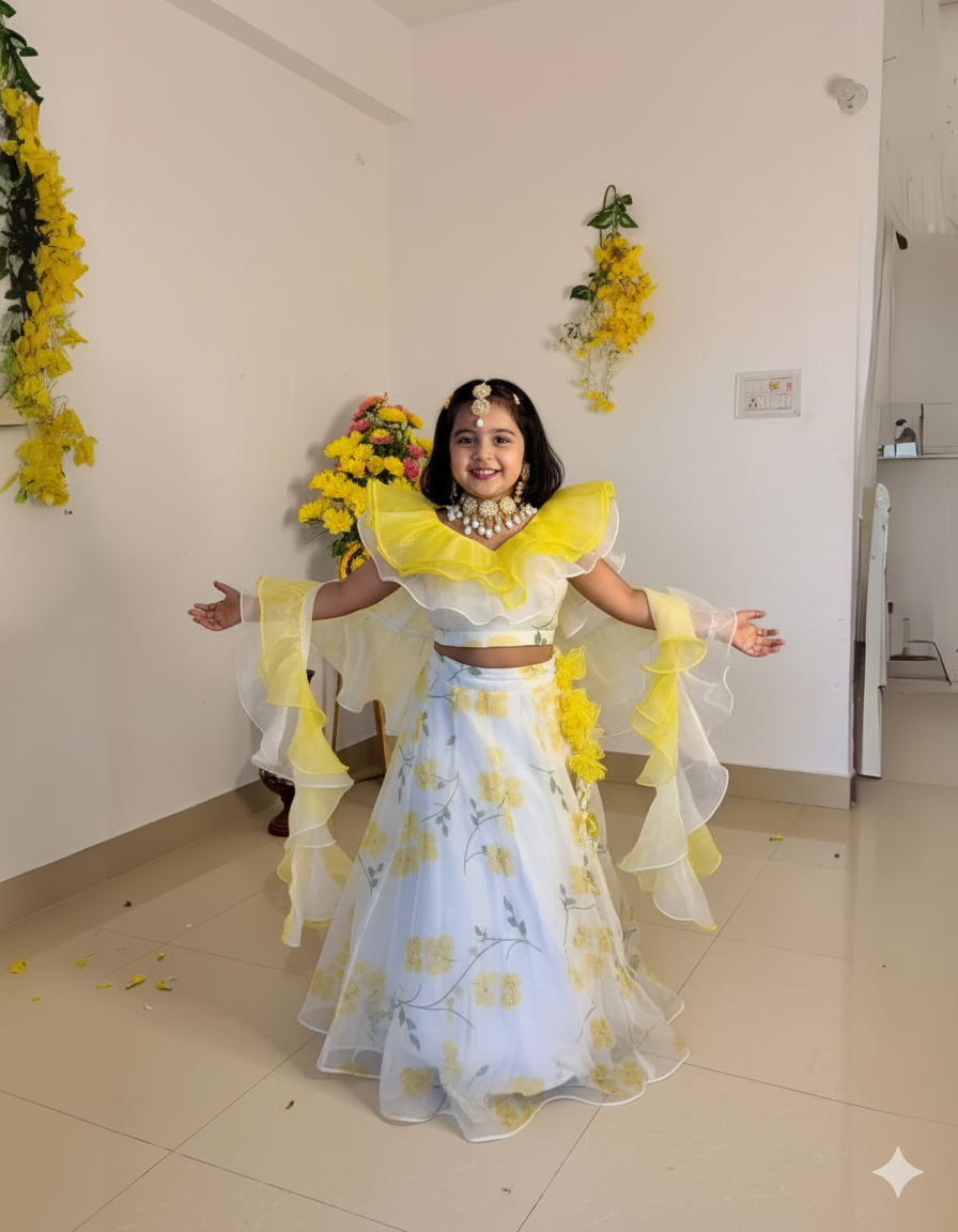 The Fabric & Feel Crafted from the finest, cloud-like Organza, this set is designed to be as light as a whisper. We chose white for purity and a vibrant, sun-drenched yellow to celebrate the tradition of the Haldi ceremony. The fabric has a natural sheen that catches the light beautifully, whether she’s running through a garden or posing for family portraits.