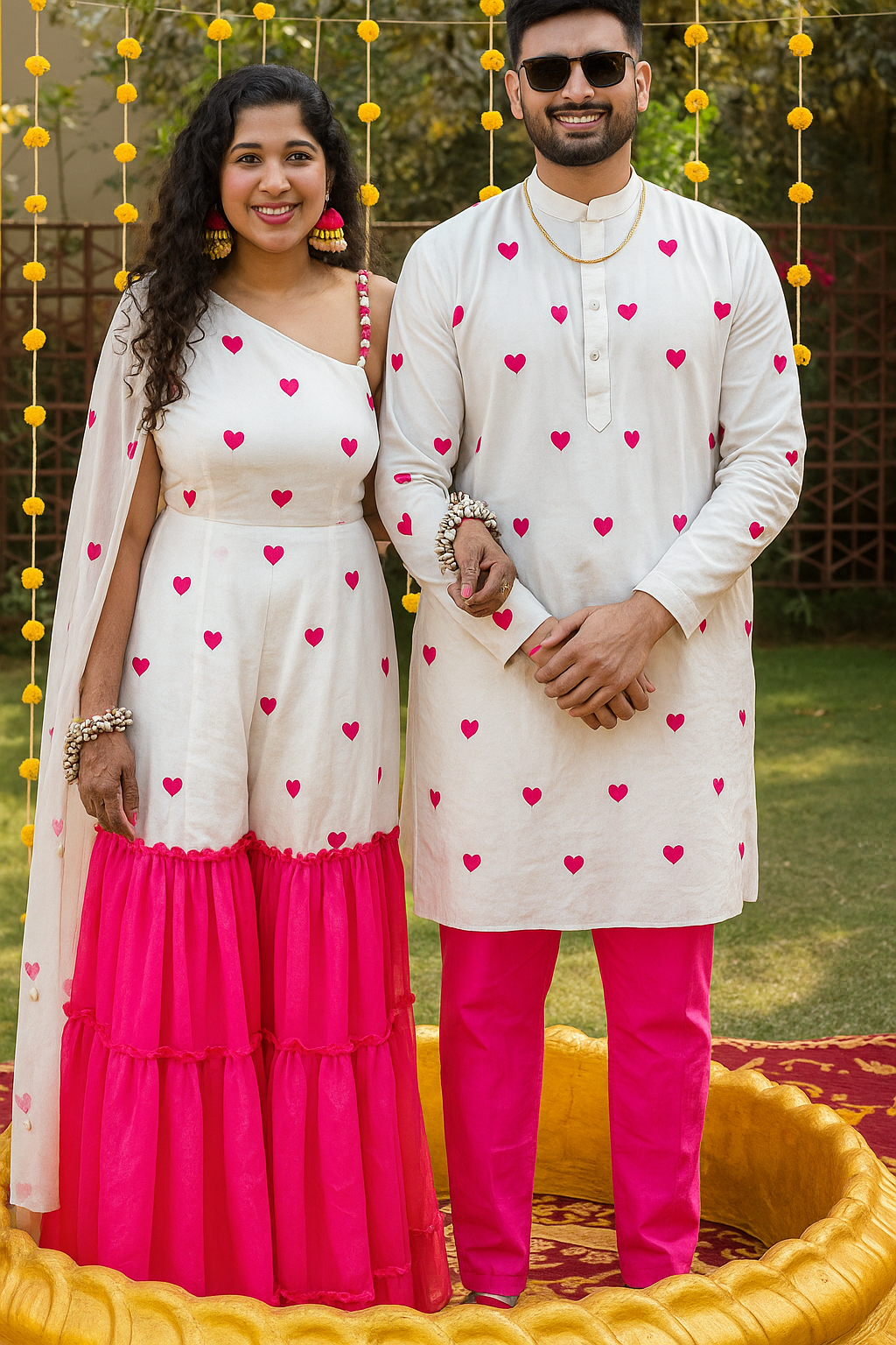 There is a unique kind of joy in wearing something that feels as light as your heart on your wedding day. Our Rosy Hearts jumpsuit is designed for the bride who wants to break away from tradition while keeping the romance alive. Crafted from the finest georgette, this outfit captures a sense of whimsical elegance, blending a pristine white base with a striking pop of deep pink. It’s more than just a garment; it’s a celebration of love and a modern statement of grace.