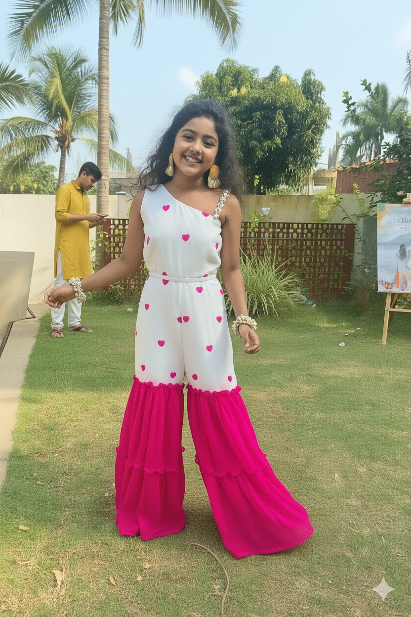 A Palette of Pure Joy There is nothing more classic than the combination of crisp white and vibrant pink. We’ve reimagined this timeless duo with a scatter of charming pink hearts, creating a look that is both sweet and high-fashion. It’s the perfect outfit for a sun-drenched Haldi, a birthday celebration, or any festive day where she deserves to be the center of attention.