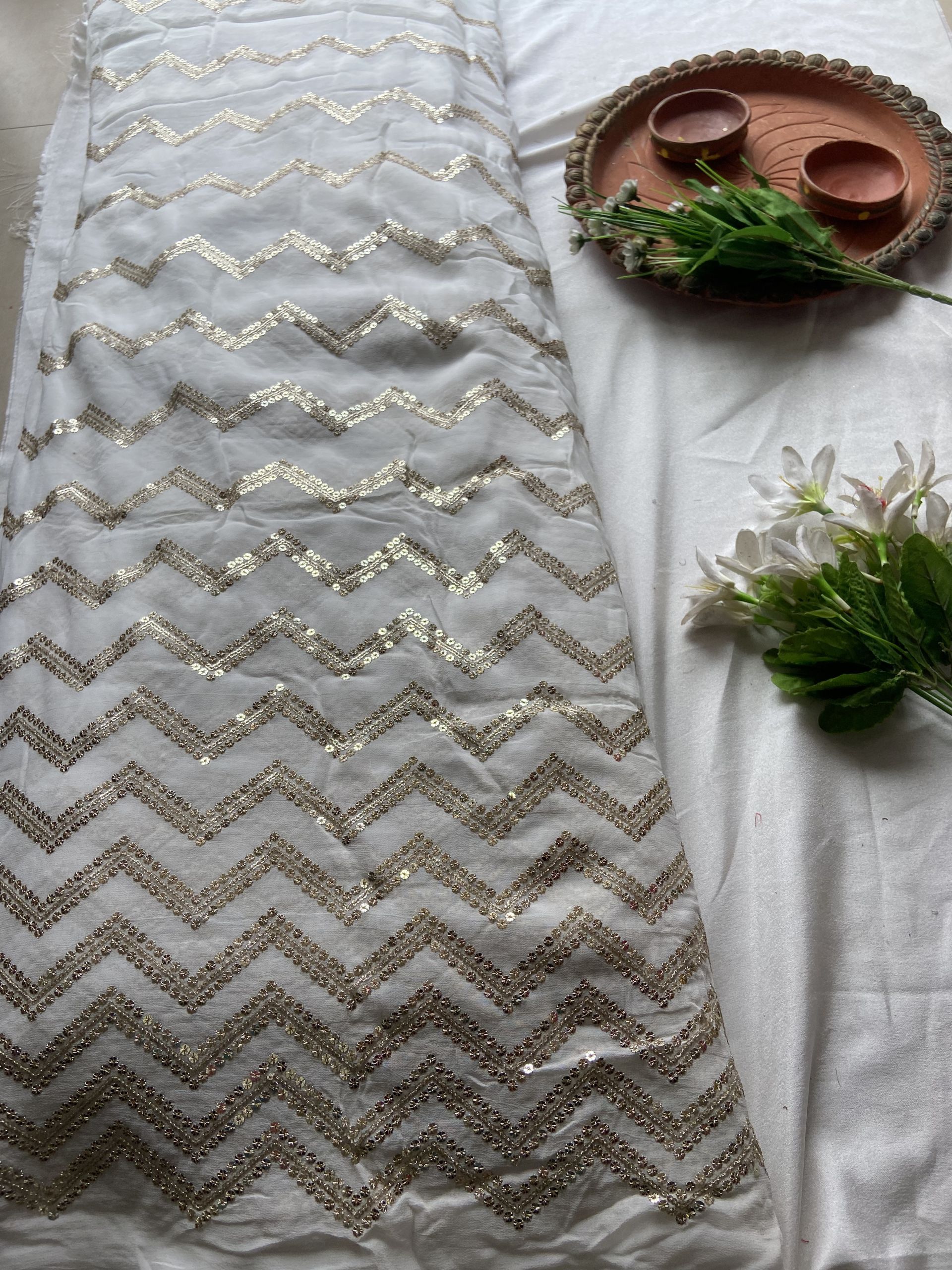 Lehenga Skirt: Crafted from flowing white georgette, the skirt comes alive with heavy embroidery that catches the light with every step.