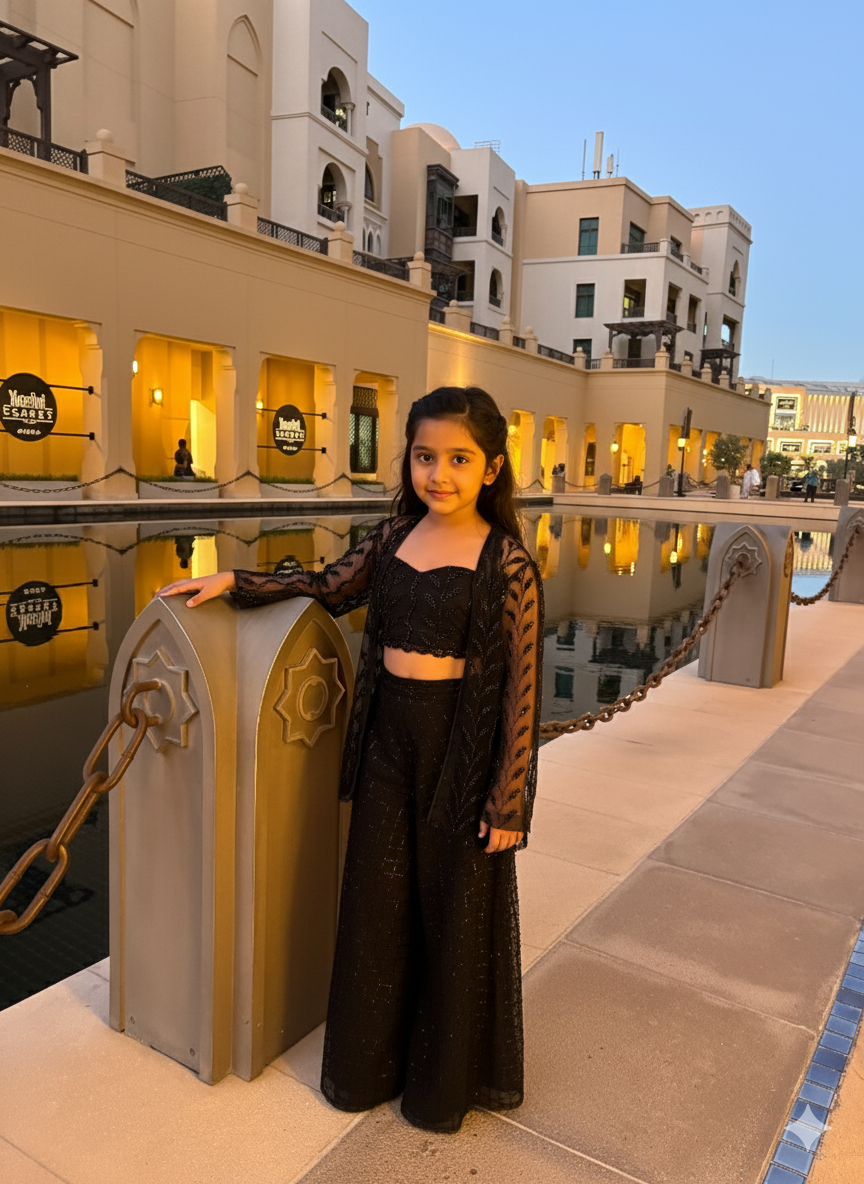 The Palazzos: The ensemble is balanced by high-waisted, wide-leg flared trousers. The fabric features a subtle, fine-grained shimmer that catches the light as you move, ensuring the all-black look never feels flat or dull.