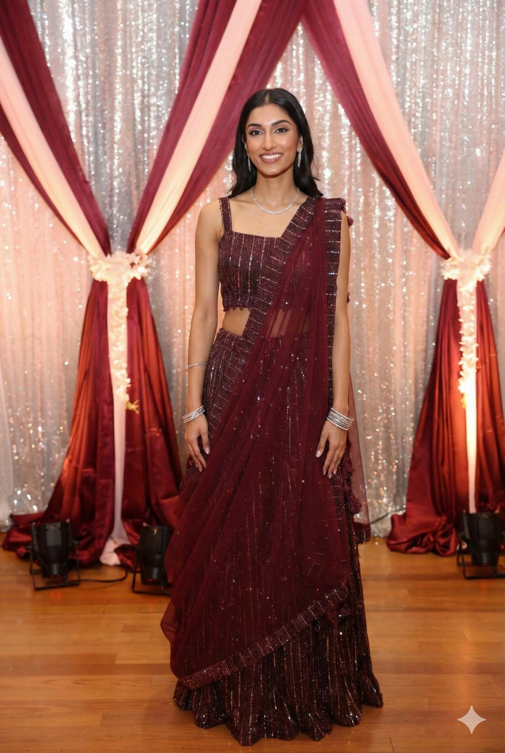 There is something undeniably magnetic about the color wine—it speaks of sophistication, evening glamour, and a touch of mystery. This stunning lehenga set captures that exact mood, designed for the woman who wants to shine without being weighed down. The deep, rich hue acts as the perfect canvas for the vertical embossed shimmer work, creating a texture that glistens beautifully under the party lights.