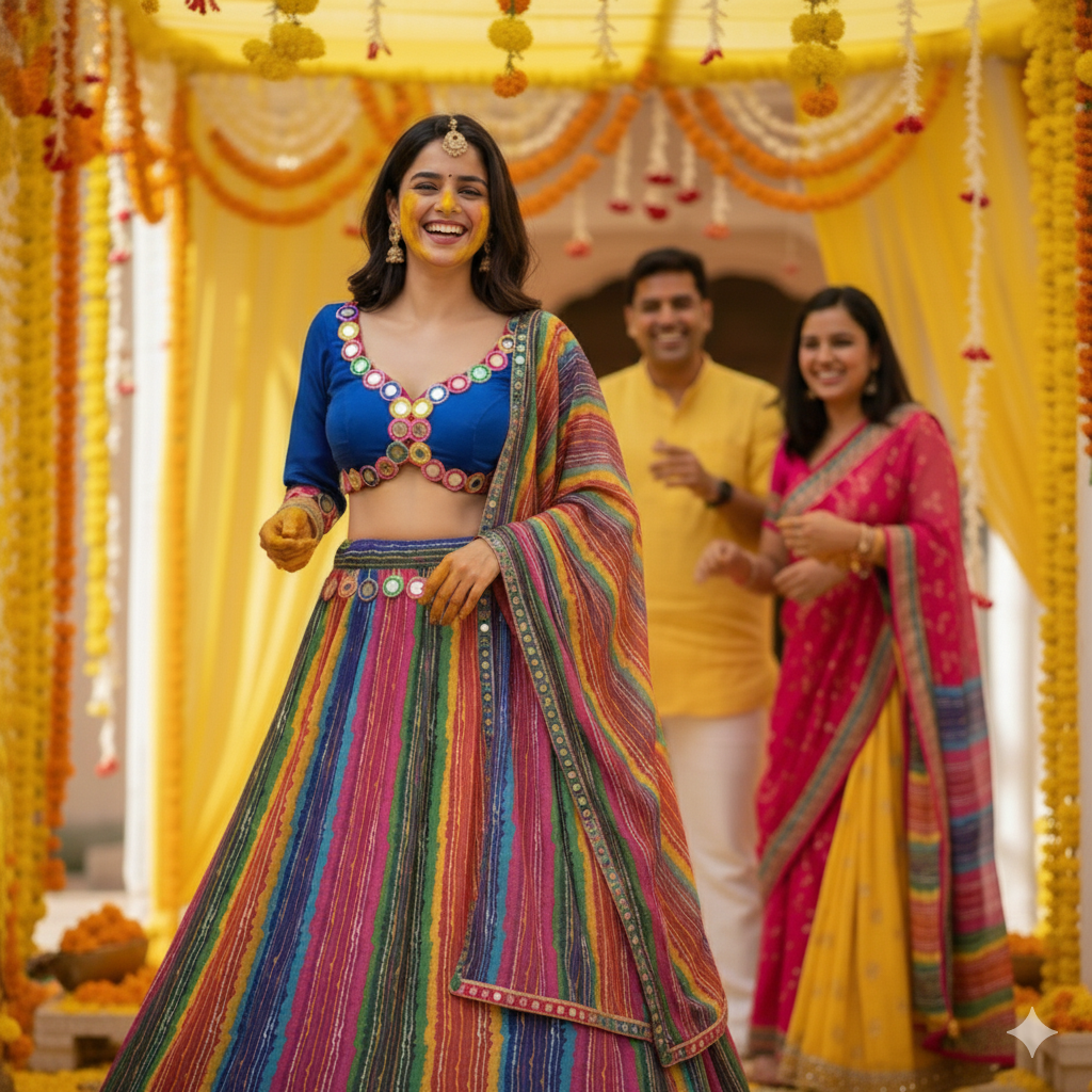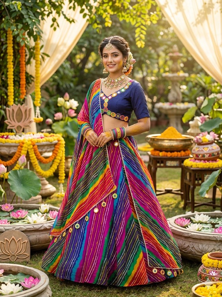 There is a unique kind of joy that comes with wearing colors that dance. Our Multicoloured Leheriya lehenga is designed for the woman who carries sunshine and celebration wherever she goes. From the moment you put it on, you’ll feel an effortless lightness—it’s an outfit that doesn’t weigh you down but rather lifts your spirit, making you feel radiant and ready for your most cherished moments.