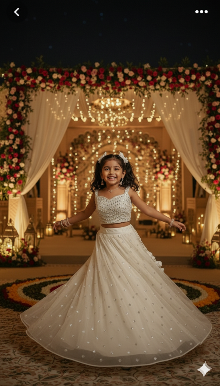 There is something truly timeless about a child in white—a sense of innocence and elegance that needs no further adornment. At Shobhini by Tini Komal, we have crafted this White Net Buti Lehenga to capture that very essence, ensuring your little one feels as comfortable as she does radiant.