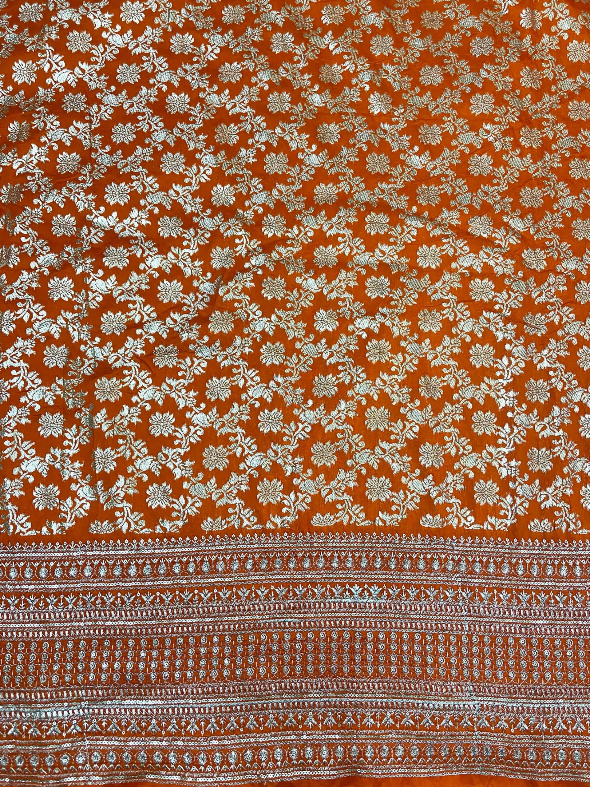 All-Over Floral Jaal: The body of the fabric is adorned with a dense, intricately woven gold zari jaal. These blooming floral motifs and winding vine patterns create a textured, high-luxury feel inspired by classic Banarasi artistry.