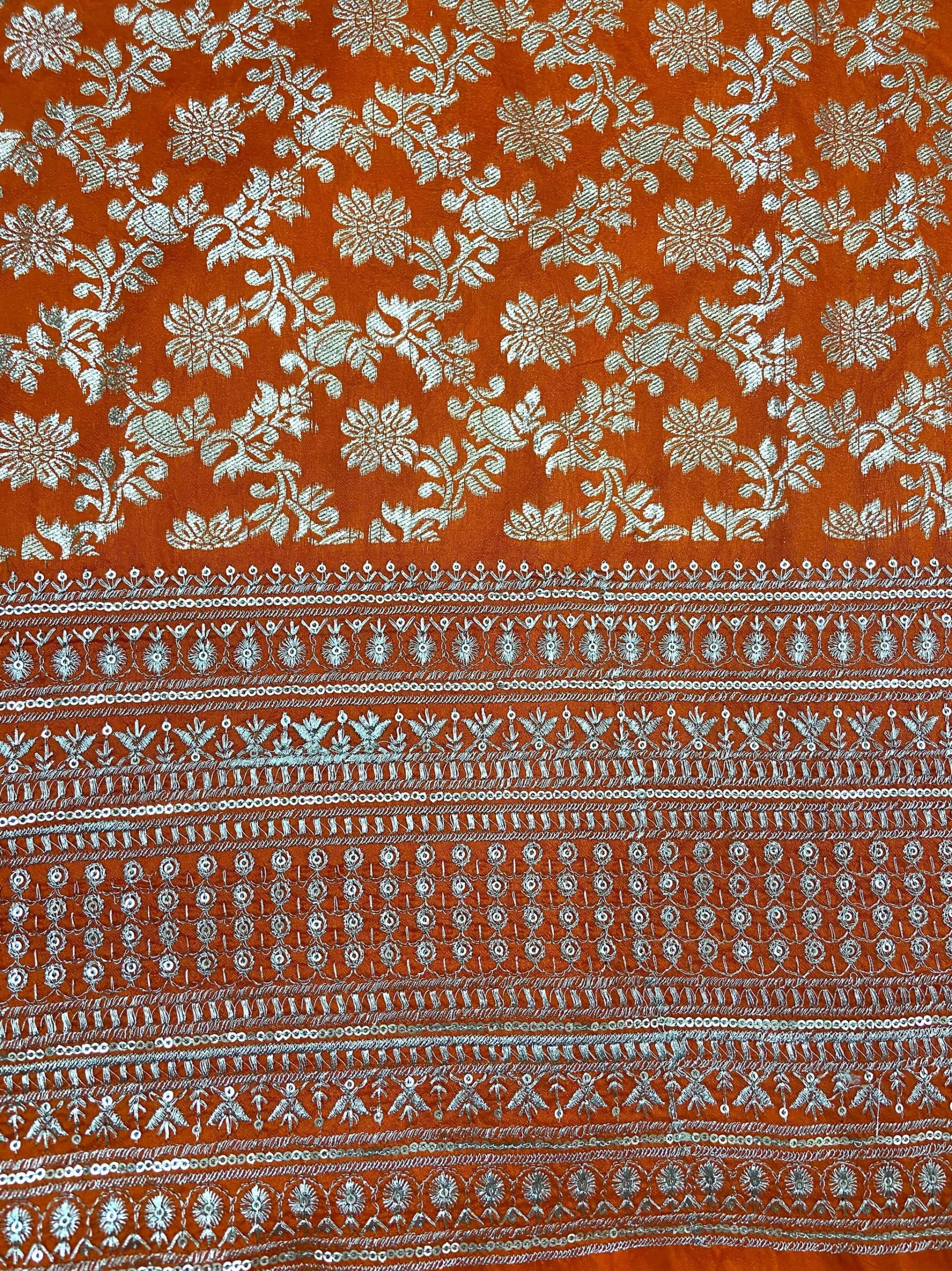 The base is a premium Organza Satin in a festive, high-energy Orange. This material offers a unique combination of the structured, ethereal qualities of organza with the smooth, lustrous sheen of satin, ensuring a graceful drape that catches the light beautifully.