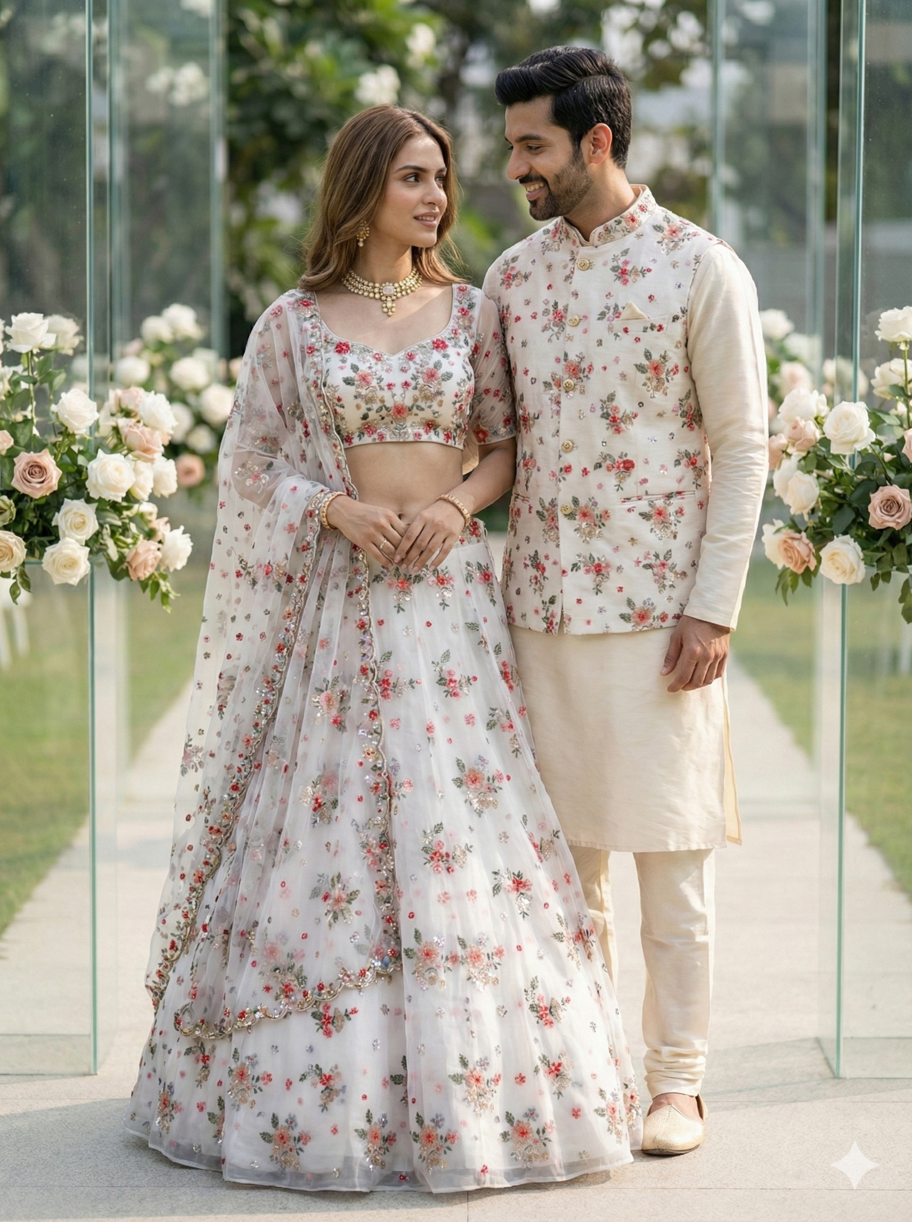 The elegance starts with the minimal, perfectly tailored crop blouse, which flows into a lehenga skirt with a magnificent five-meter flare. This generous volume creates a rhythmic, liquid-like grace as you move through your festivities. To add a layer of soft drama, the sheer Net dupatta features a subtle lace border that catches the light beautifully. For the groom, we’ve translated this botanical charm into a sharp, printed Organza Bandi, grounded by the timeless, regal feel of Pure Raw Silk for a perfectly synchronized couple’s look.