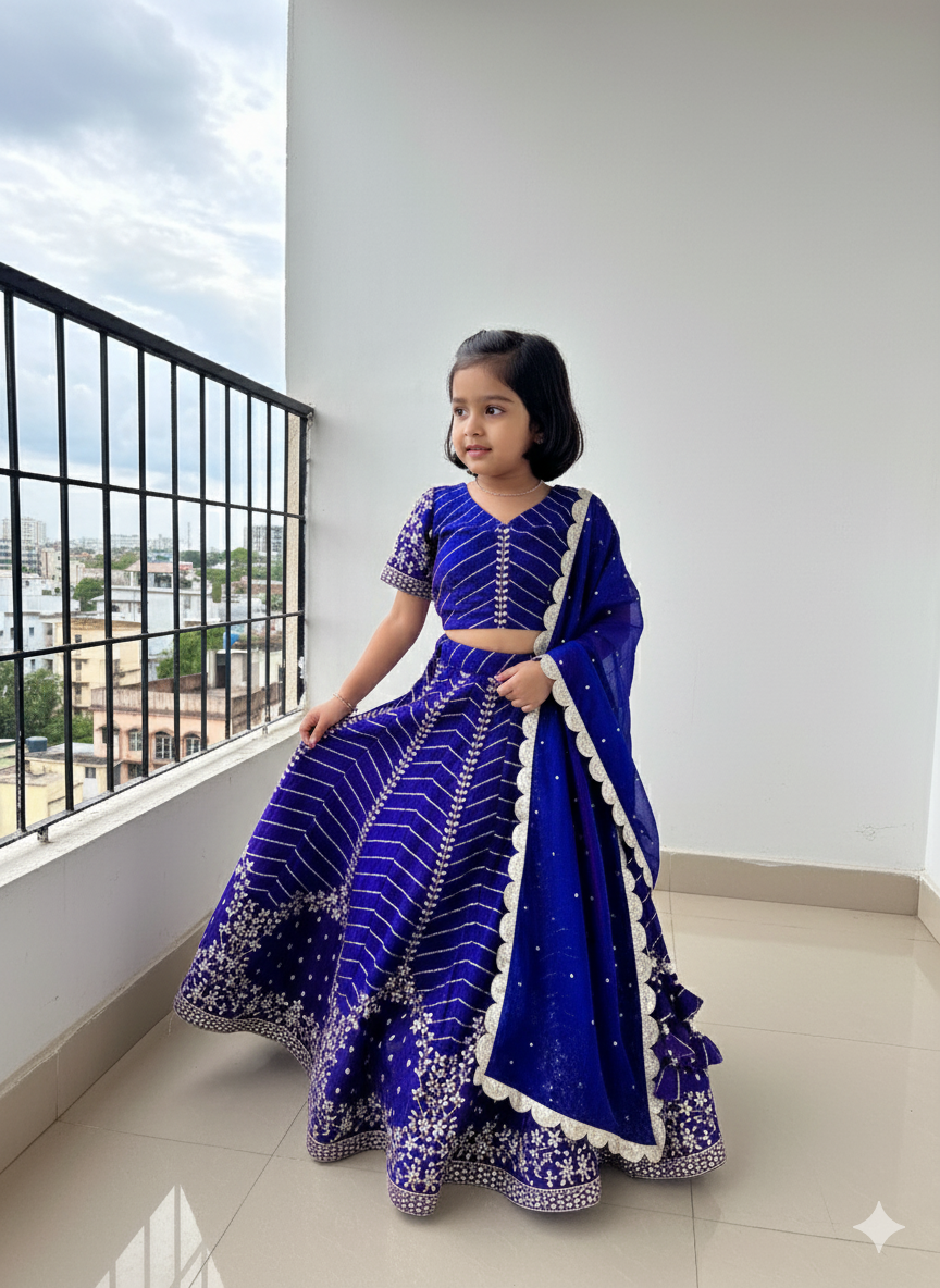 The Shobhini Promise We know that for children, the best luxury is the freedom to play. This lehenga is pre-stitched for a flawless fit, with a soft inner lining that ensures she feels as good as she looks. It is a piece designed for grand entrances at wedding receptions, high-energy Sangeet nights, and festive galas.