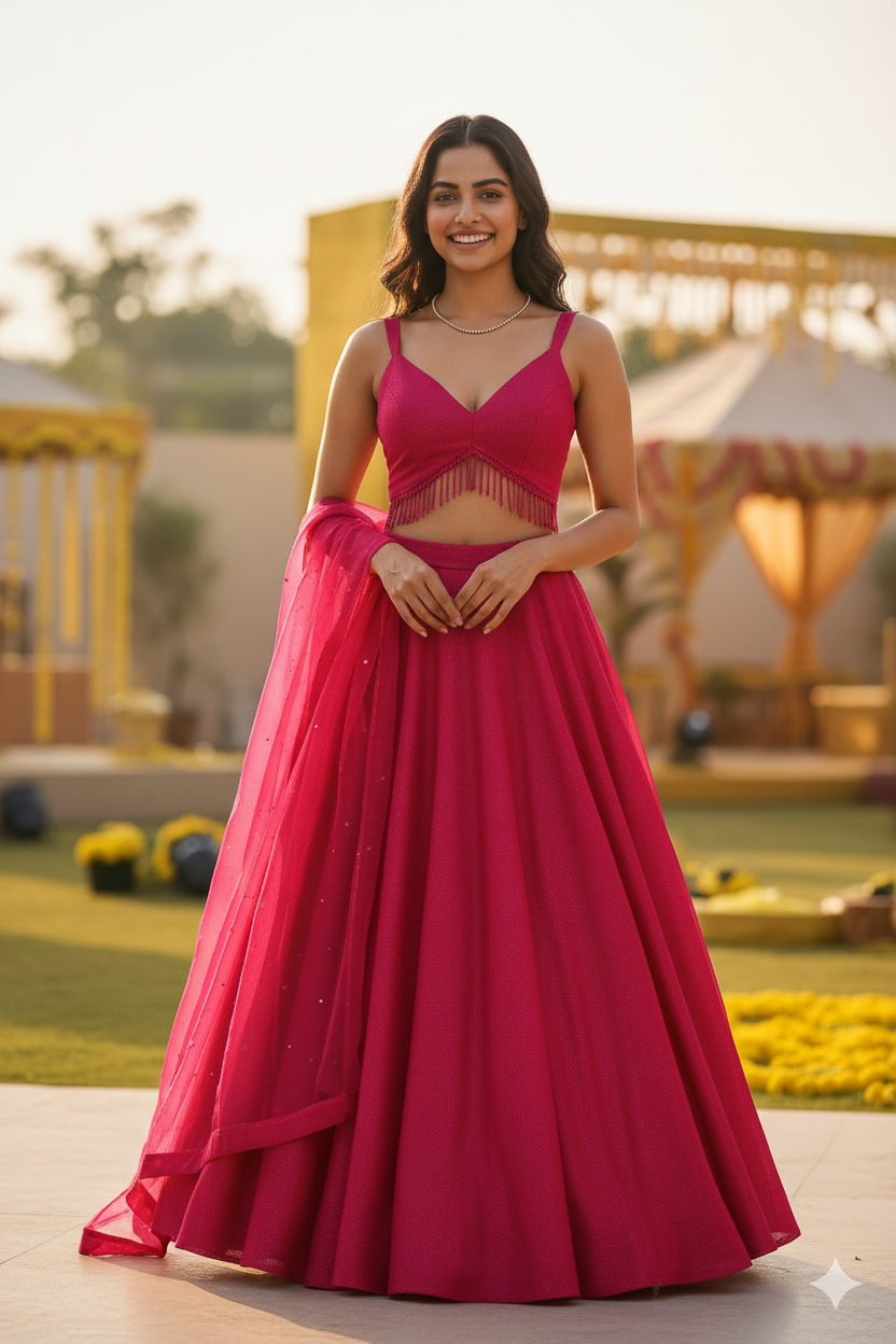 There is no color quite as joyful as hot pink—it instantly lifts your mood and lights up the room. This monochromatic lehenga set is designed for the modern woman who believes that less is more, and that true style lies in the cut and the confidence of the wearer. It feels as light as air, letting you enjoy your special moments without being weighed down by heavy layers.