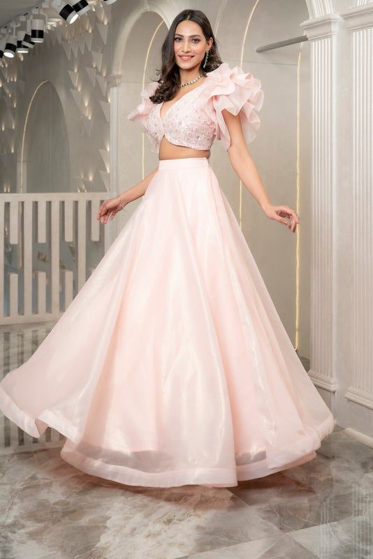 Step into a daydream with this enchanting pastel pink lehenga set, designed for the woman who loves to make a statement without saying a word. This outfit captures the essence of modern romance, blending the ethereal lightness of premium organza with a silhouette that is both playful and regal.