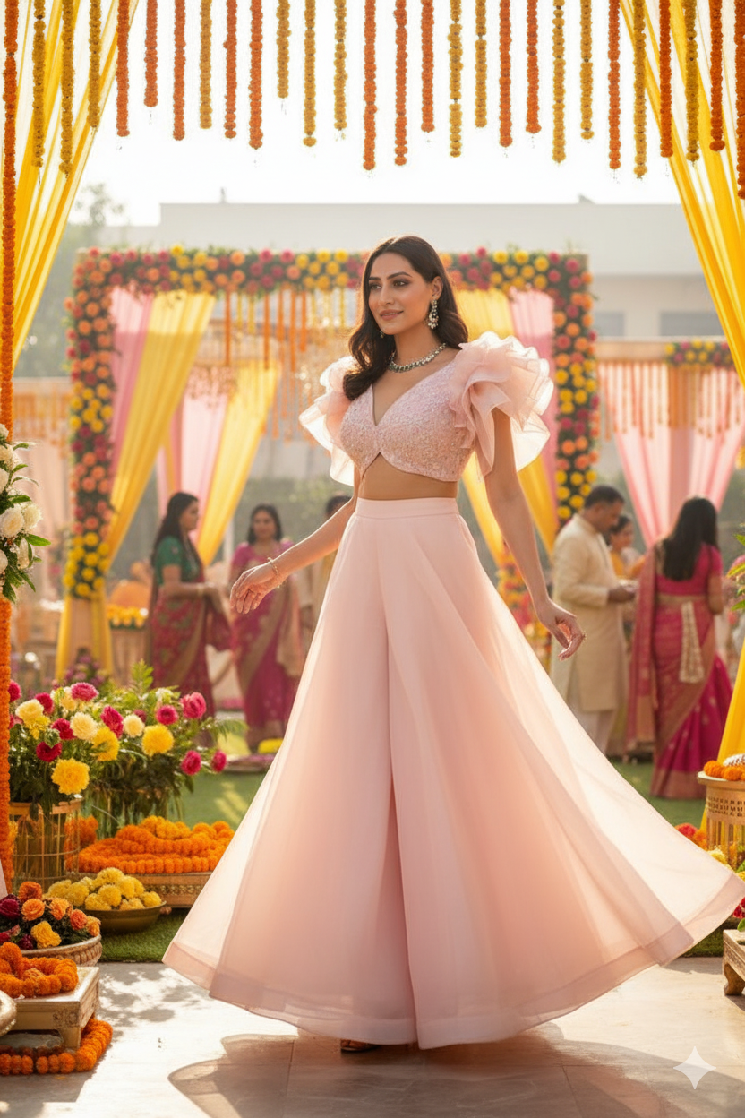 Beneath the statement top flows a pair of voluminous, high-waisted palazzos. While they offer the grand look of a lehenga skirt, they provide the freedom and comfort of trousers. The smooth organza fabric falls beautifully, creating a clean, minimal look that sways and swirls with every step you take. Since the sleeves provide all the drama, this set is designed to be worn without a dupatta, keeping your hands free for champagne or dancing.