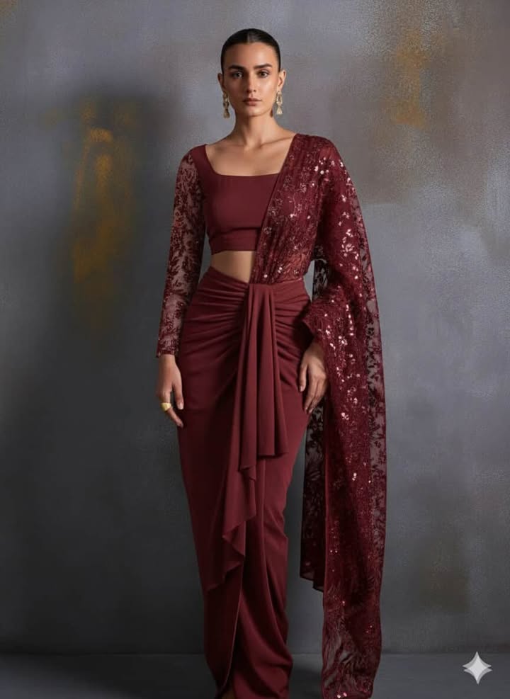 There is something truly poetic about the way a Wine-colored saree catches the light during a sunset wedding or a candlelit reception. This Shobhini creation isn’t just an outfit; it’s a mood. The deep, intoxicating tones of the pure crepe fabric drape over the body like a second skin, offering a royal aesthetic without the weight of traditional heavy ensembles.