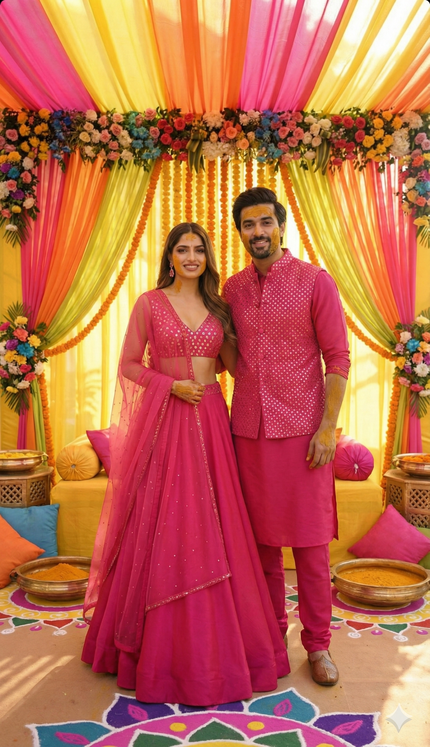 The blouse is where the detail truly shines; the faux mirror work is hand-placed to create a shimmering effect that feels both traditional and fresh. Paired with a delicate net dupatta that rests lightly on your shoulder, the entire outfit feels like a second skin. For the groom, we’ve mirrored this elegance with a coordinated Satin Silk kurta and a Georgette bandi, ensuring you both look like a perfectly matched vision.