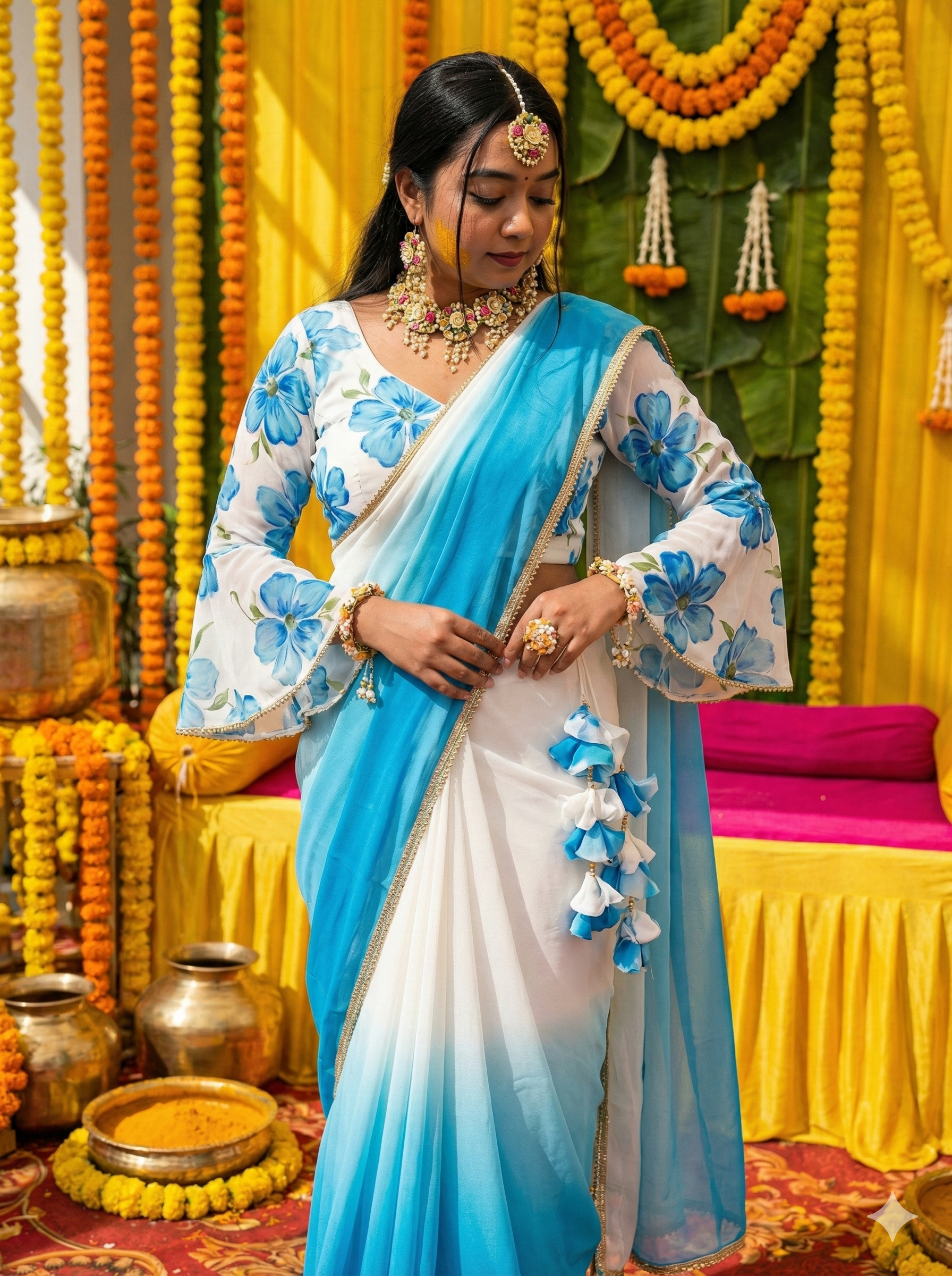 There is a quiet, breathtaking magic in the colors of the morning sky—a soft transition from pure white to a gentle blue that feels like a fresh beginning. This Pure Georgette saree is designed for the woman who finds her power in grace and her style in simplicity. From the moment you drape it, the fabric falls with a liquid-like weightlessness, making you feel as though you are wrapped in a soft summer breeze, ready to step into your celebration with effortless poise.