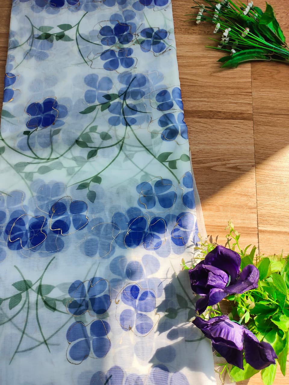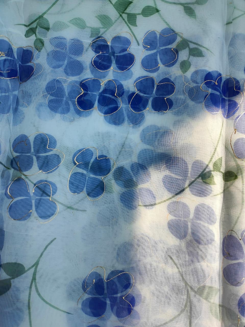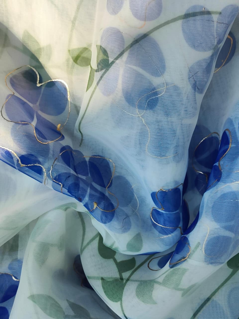 Elevate your creations with this exquisite white organza fabric, adorned with a delicate purple floral print that exudes charm and sophistication. The design is beautifully enhanced with luxurious gold foil detailing, adding a subtle shimmer that catches the light with every movement.