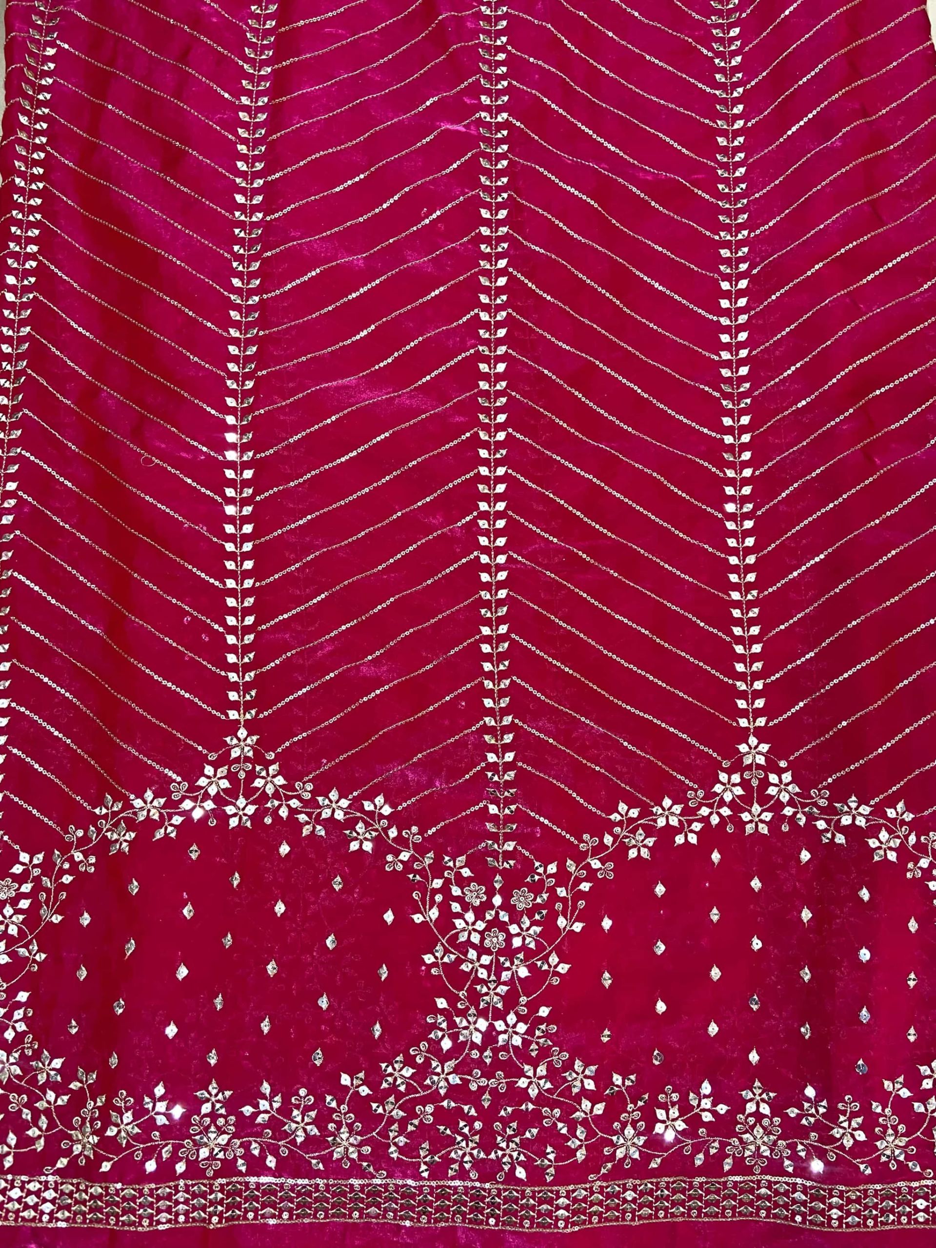 A radiant Rani Pink Organza Satin fabric featuring opulent gold zari and sequin embroidery. Designed in a “heavy daman” style, it showcases intricate floral vines and shimmering diagonal patterns, making it an ideal choice for high-end festive and bridal wear.