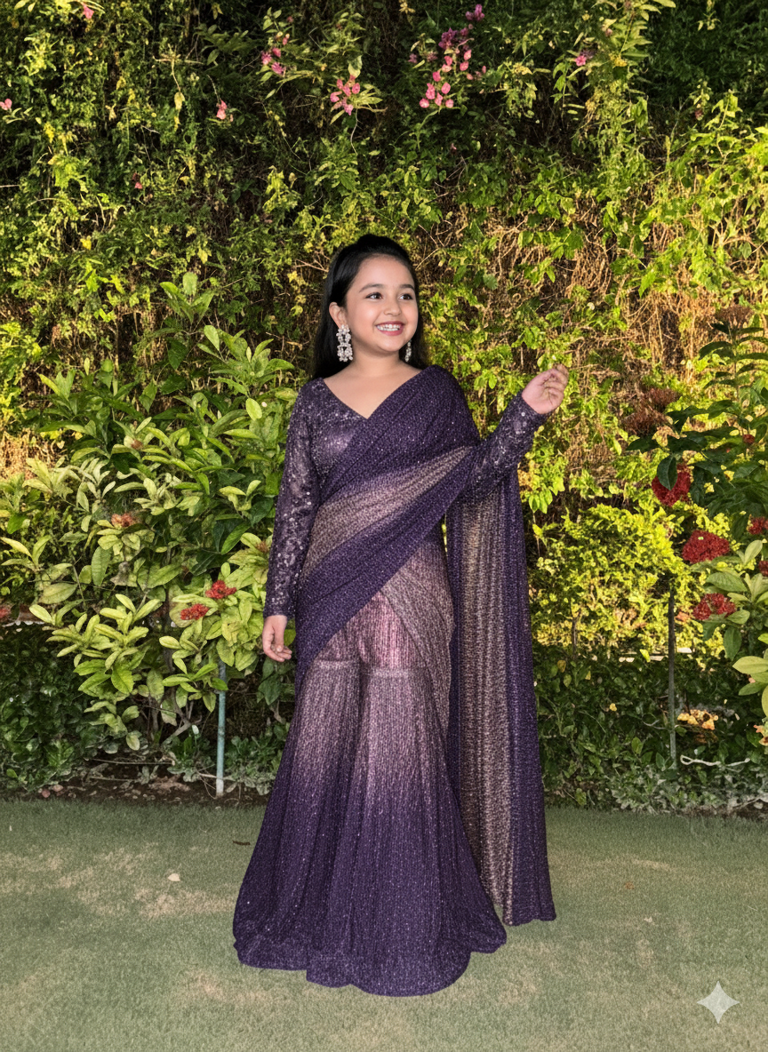 Dazzling Sophistication: The Ultimate Festive Sharara Saree Elevate your child’s wardrobe with our Purple Shimmer Lycra Sharara Saree, a masterpiece of modern ethnic fusion. This outfit is designed for children who love the elegance of a saree but need the freedom to move and play.