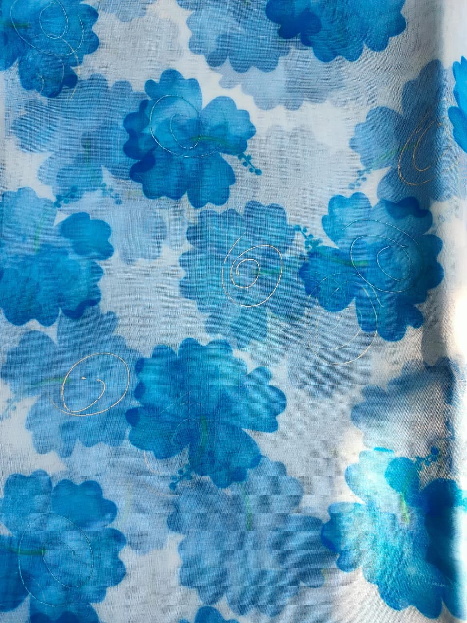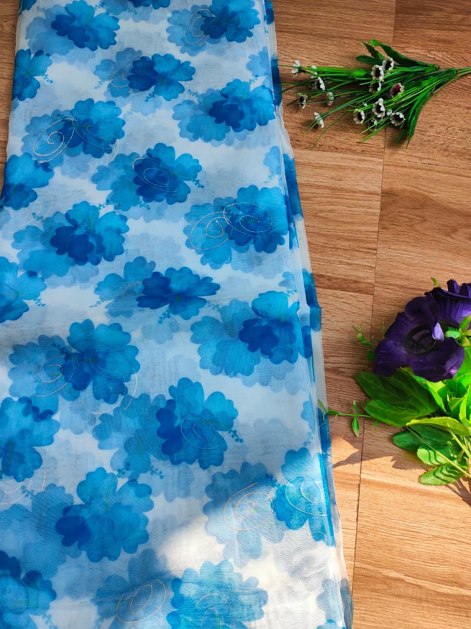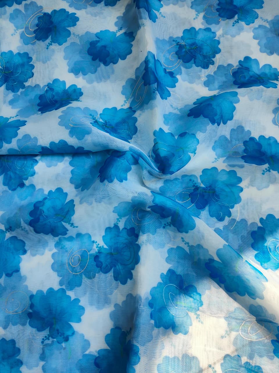 Sky Blue floral Print With Gold Foil Detailing Organza Fabric