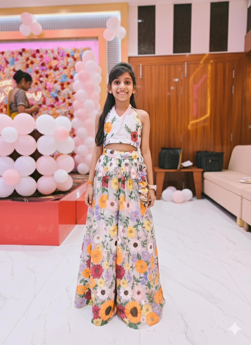 There is a pure, infectious joy in watching a child explore a garden, and that is exactly the spirit we’ve woven into the Multicolour Thread Embroidery Plazo Set. At Shobhini by Tini Komal, we wanted to create a piece that feels light, airy, and utterly magical for your little muse.