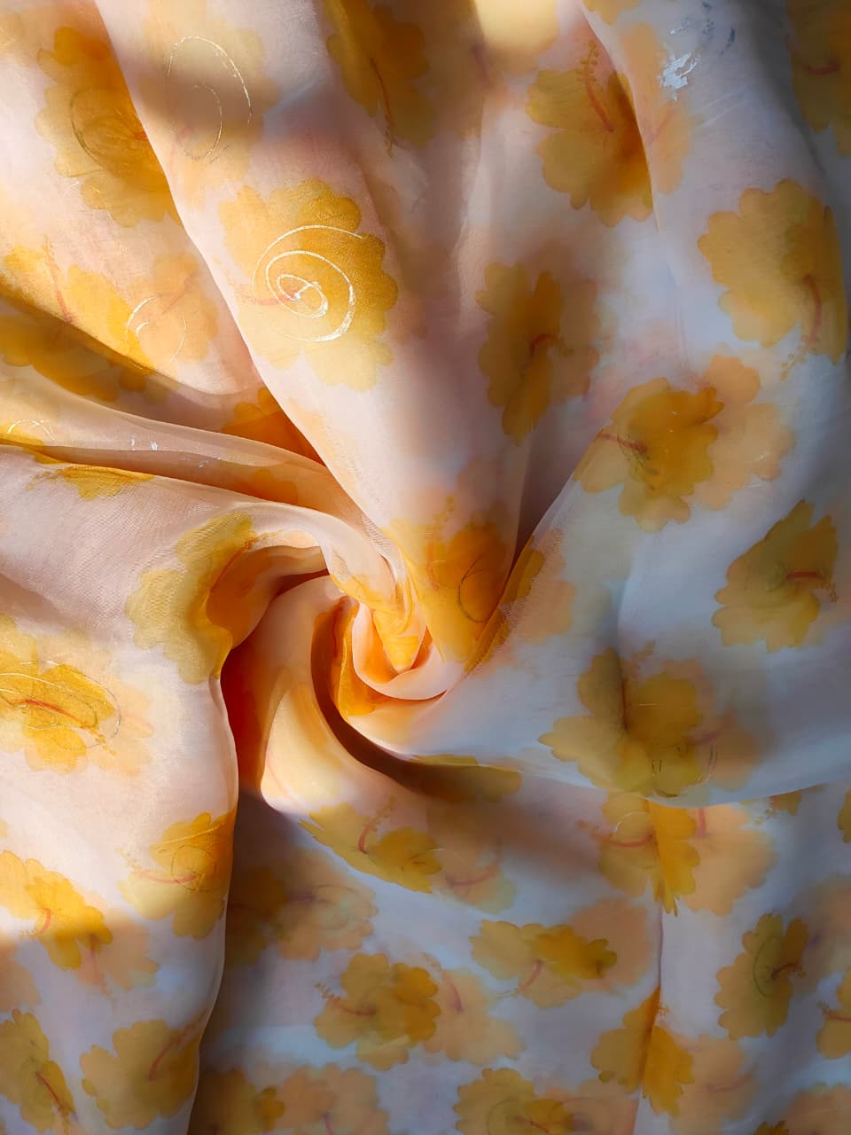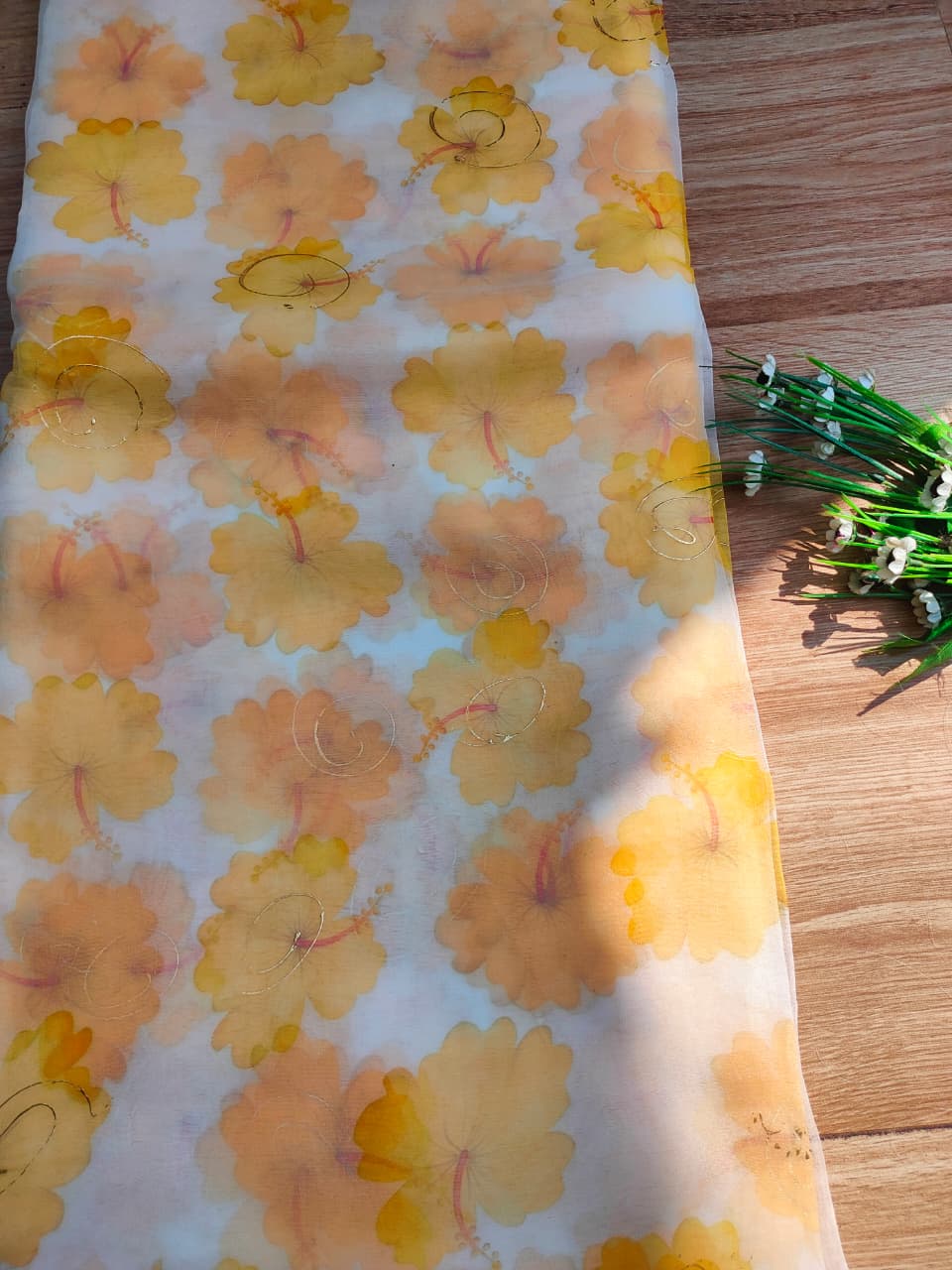 Brighten your designs with this stunning organza fabric, featuring a vibrant yellow floral print that brings freshness, elegance, and a cheerful charm to any creation. Enhanced with luxurious gold foil detailing, the fabric shimmers beautifully, adding a touch of opulence that elevates its overall appeal.